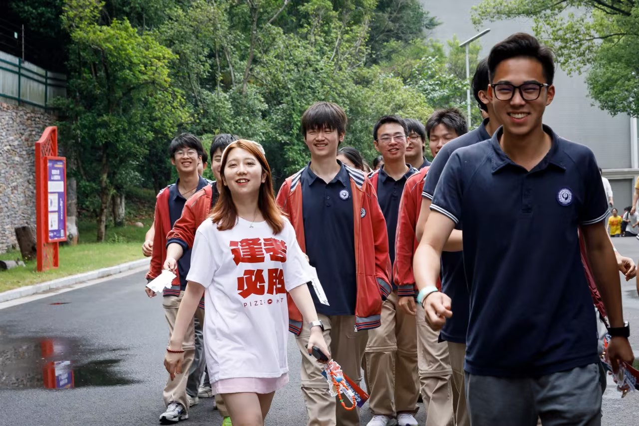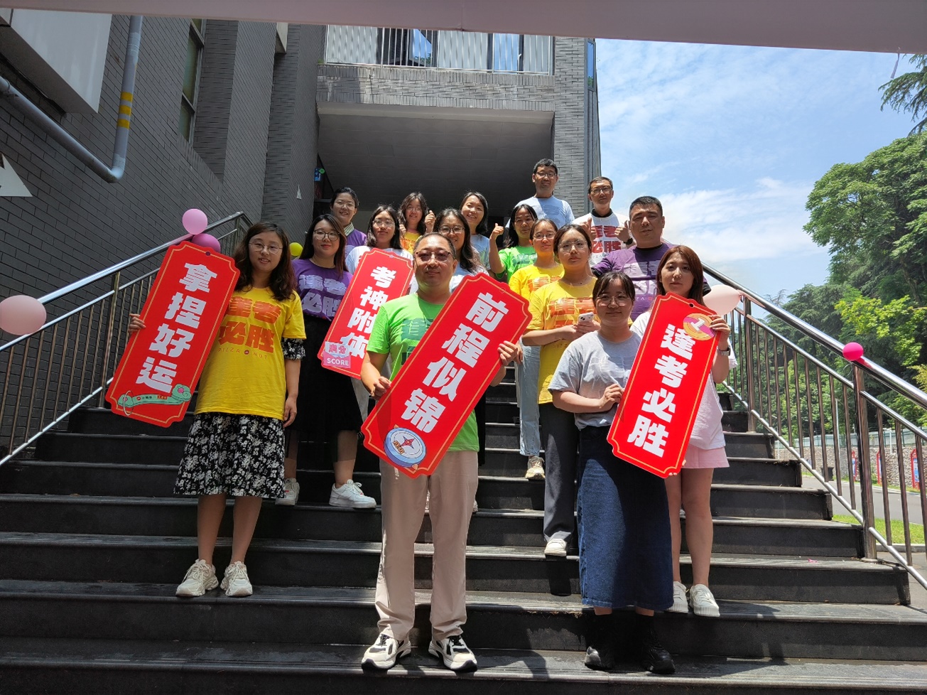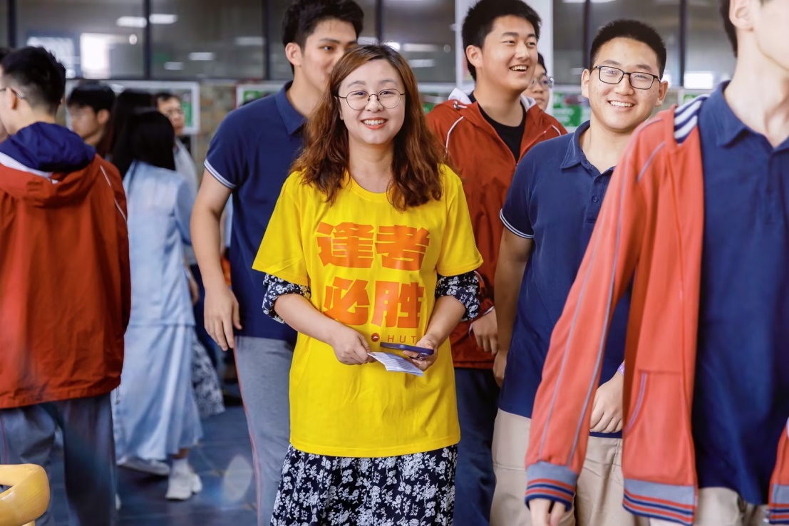 九中必胜天团的班主任们身着五彩好运衫,花式送祝福。黄色代表金榜题名,紫色代表“紫”定都会,灰色代表一路辉煌……必胜天团行走在必胜餐厅形成了一道亮丽的助考风景线,以此花式助考,希望学生们都能轻松应考,好运buff加持,拿捏心仪offer。