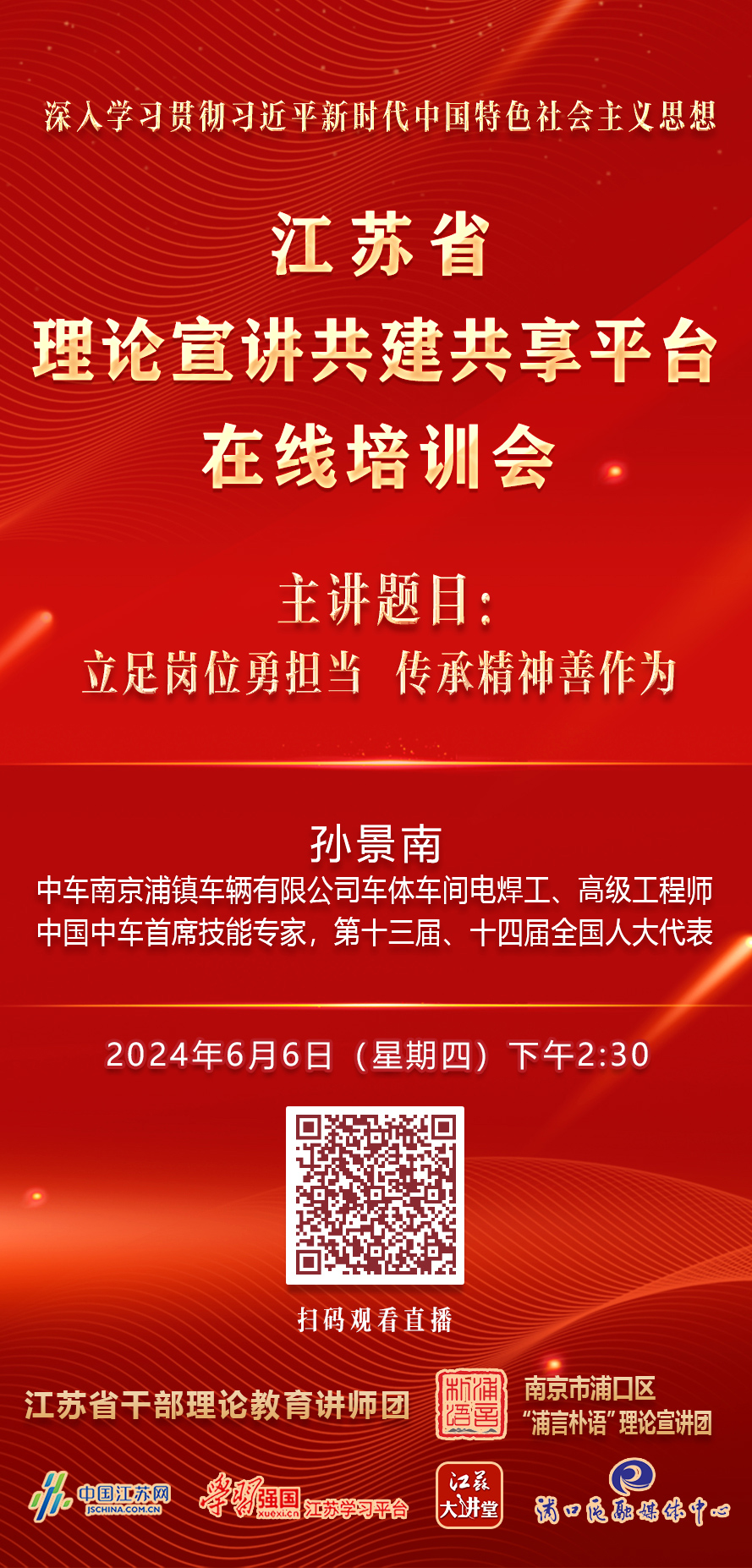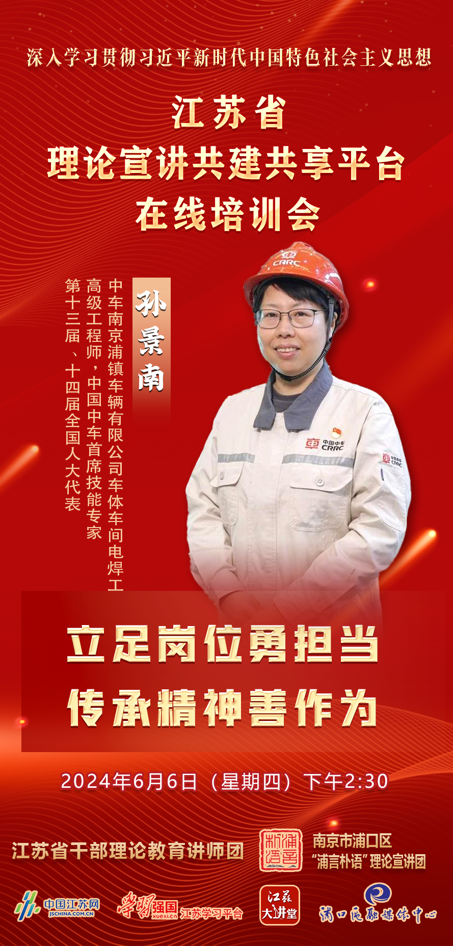 千秋基业、人才为本。技能人才特别是高技能人才,是国家战略人才的重要组成部分,是支撑中国制造、中国创造的重要力量。江苏省理论宣讲共建共享平台在线培训会特邀第十四届全国人大代表,中车南京浦镇车辆有限公司车体车间电焊工、高级工程师孙景南以《立足岗位勇担当 传承精神善作为》为主题,做专题授课培训。
