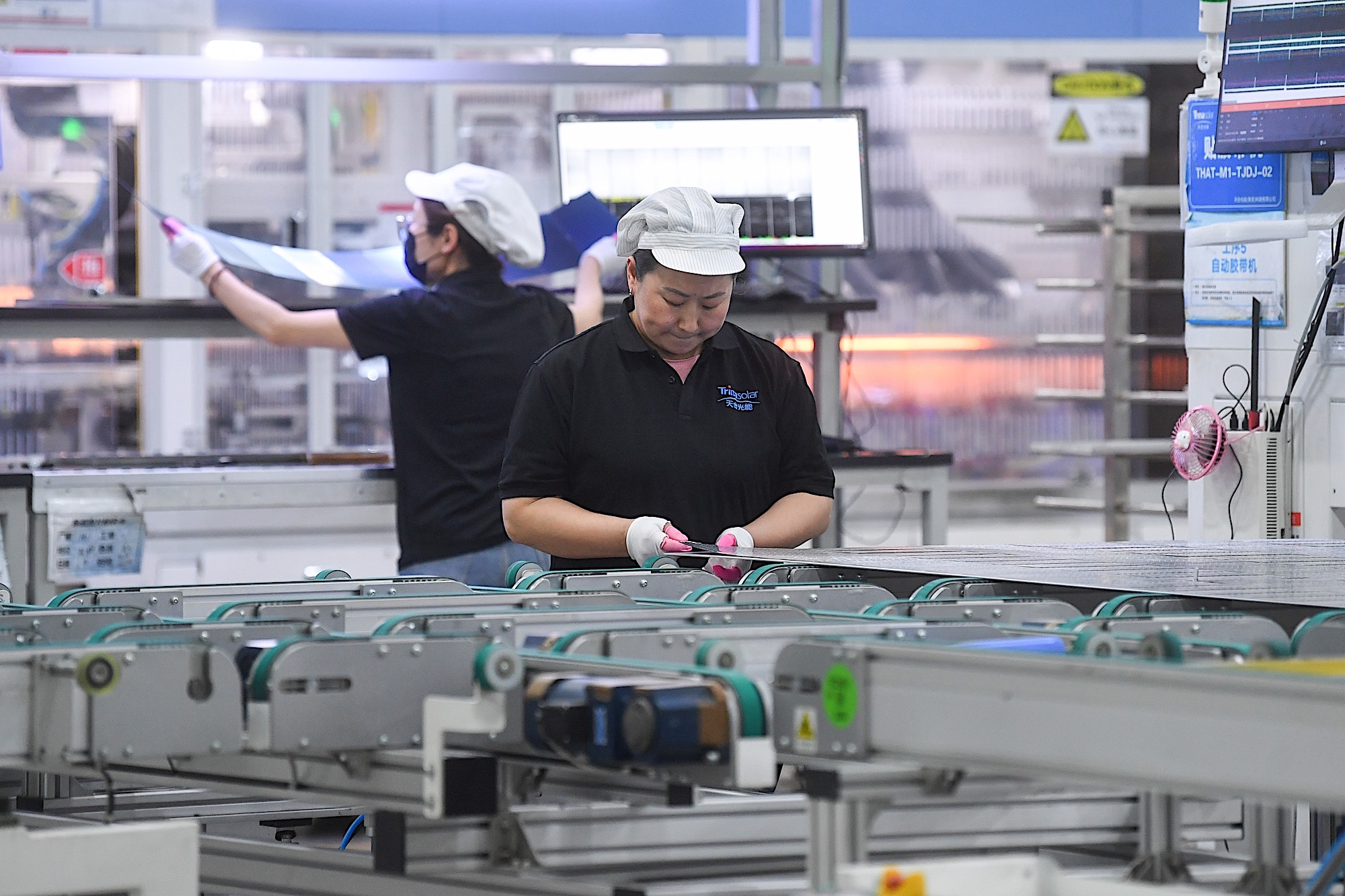 交汇点讯 生产线上机器轰鸣,机械臂上下挥舞,一块块光伏产品经过制绒、硼扩、选择性发射极、氧化、AI智能检测等16道工序组装完成……6月4日,高质量发展调研行记者走进天合光能淮安基地,见证这里光电高效转化催生的无限潜能。