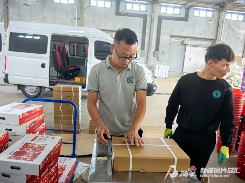 顺丰快递小哥正在给“喀什红”水果番茄打包。刘俊杰摄