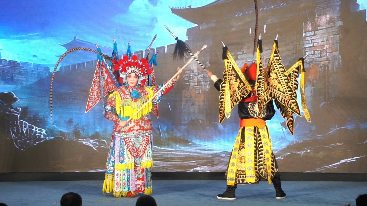 随着鼓点伴奏响起,苏三上场,高亮的嗓音引来叫好不断。第二出戏《女杀四门》中方舒卓饰演的刘金定一上场,就靠着她飒爽英姿,在舞台上翻打腾跃赢得了观众们的阵阵掌声。