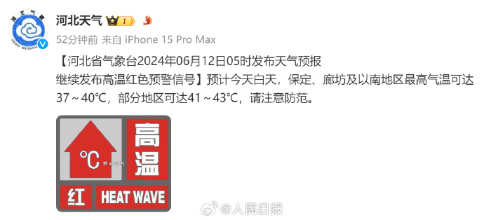12日,@河南气象 、@河北天气 发布高温红色预警。注意防暑降温!