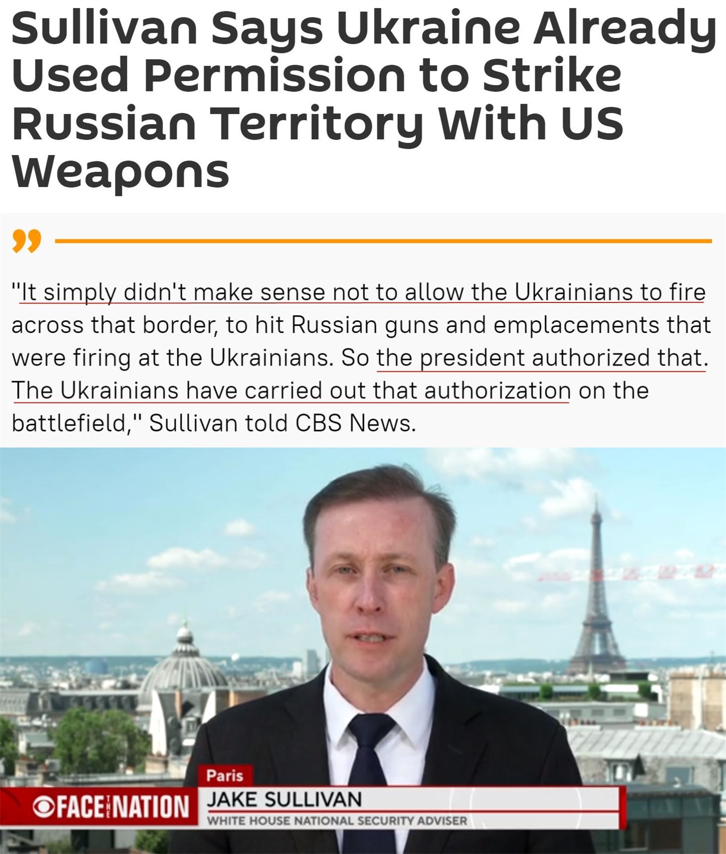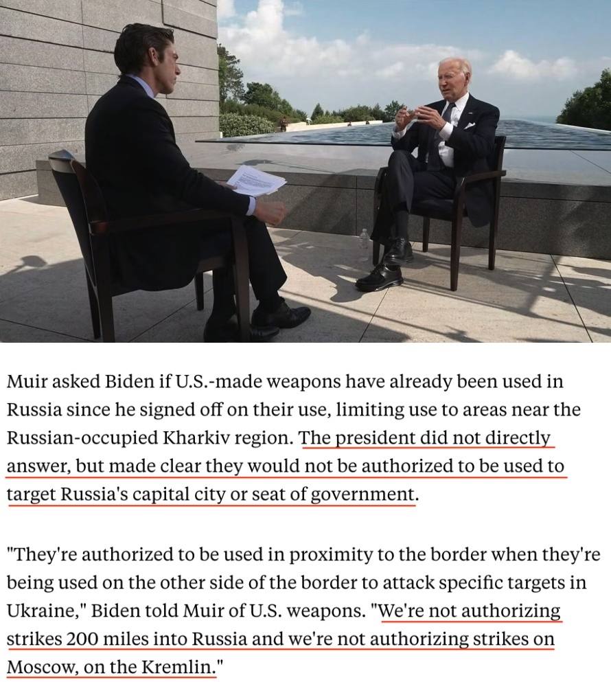 “它们(这些武器)被授权在(乌俄)边境附近使用……我们没有授权(乌克兰)向俄罗斯境内200英里(约合320公里)的地方发动袭击,也没有授权对莫斯科、克里姆林宫进行打击。”