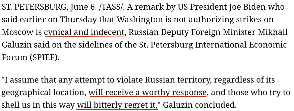 对此,俄罗斯副外长加卢津回应称,拜登关于可以袭击俄边境地区、但不能袭击莫斯科和克里姆林宫的表态是“卑鄙且失礼”的。