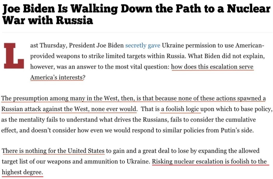 文章认为,允许乌克兰扩大美援武器的打击范围对美国有百害而无一利。在美国安全并未受到威胁的情况下,冒险与俄罗斯爆发核战争简直“蠢透了”。