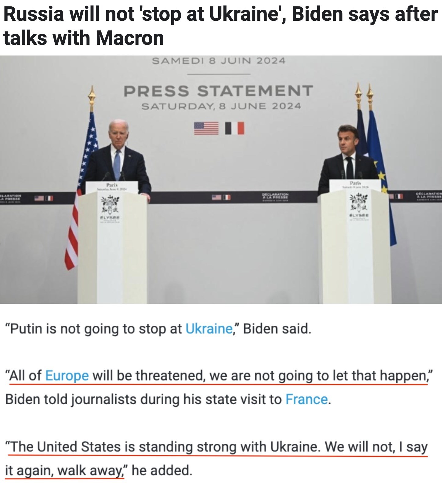 “俄罗斯不会止步于乌克兰,整个欧洲都将受到威胁,我们不会让这种情况发生……美国坚定地支持乌克兰。我再说一遍,我们不会走开。”