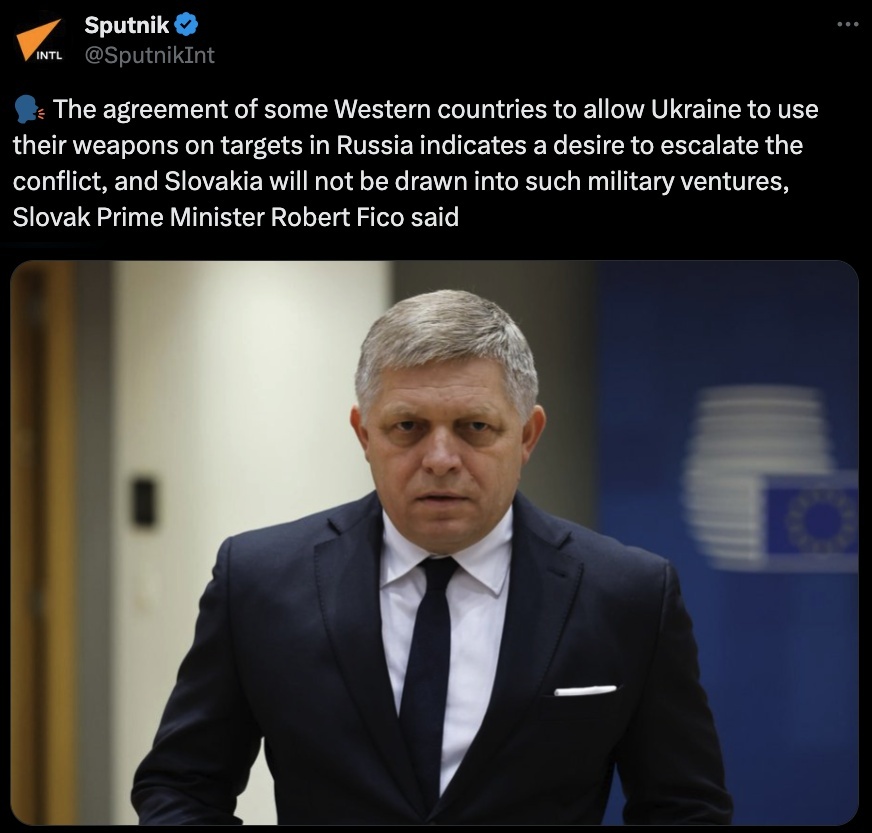 斯洛伐克总理菲佐日前也表示,西方国家允许乌克兰使用西方武器袭击俄罗斯本土目标,只能证明它们想要的不是和平,而是它们与俄罗斯紧张关系的升级,斯洛伐克不会被拉入这样的军事冒险。