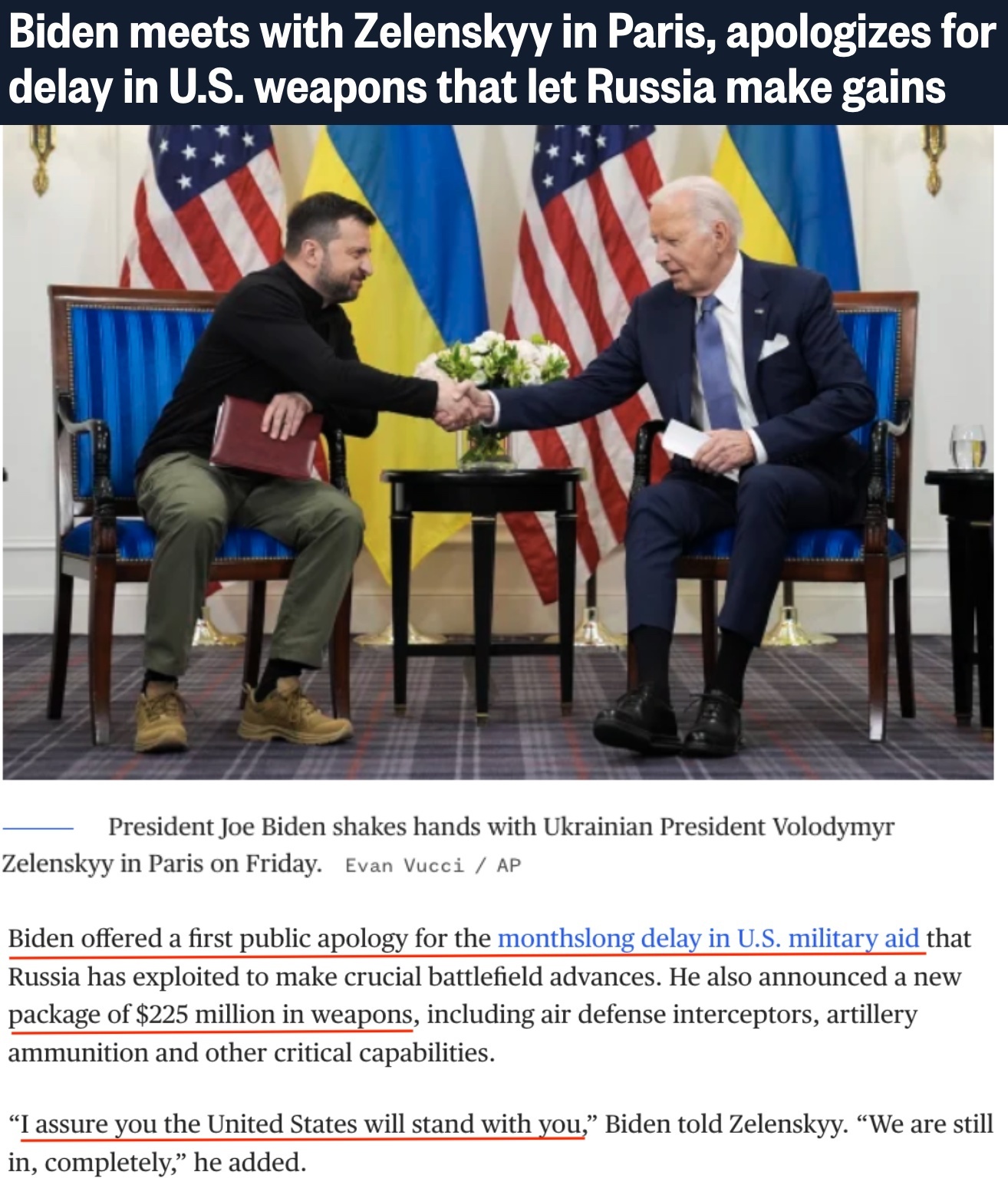 在巴黎会见乌克兰总统泽连斯基时,拜登首次就美国国会未能更早通过对乌新援助法案“道歉”,并宣布将再向乌克兰提供2.25亿美元援助。