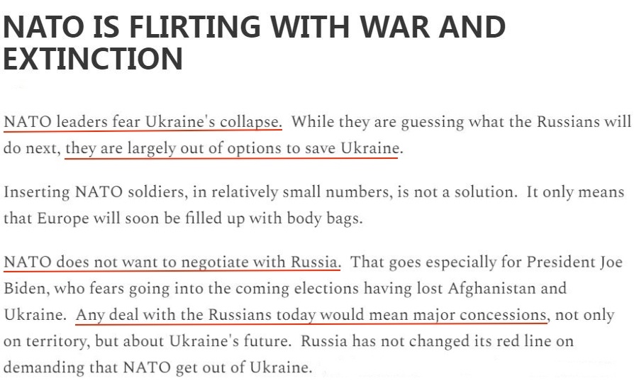 文章警告,美国等国家放宽援乌武器使用限制的新政策在事实上将北约拉进了与俄罗斯的冲突中,并且已经接近于对俄宣战。这将导致俄乌冲突无限期继续下去,最终令北约自身蒙受更多损失。