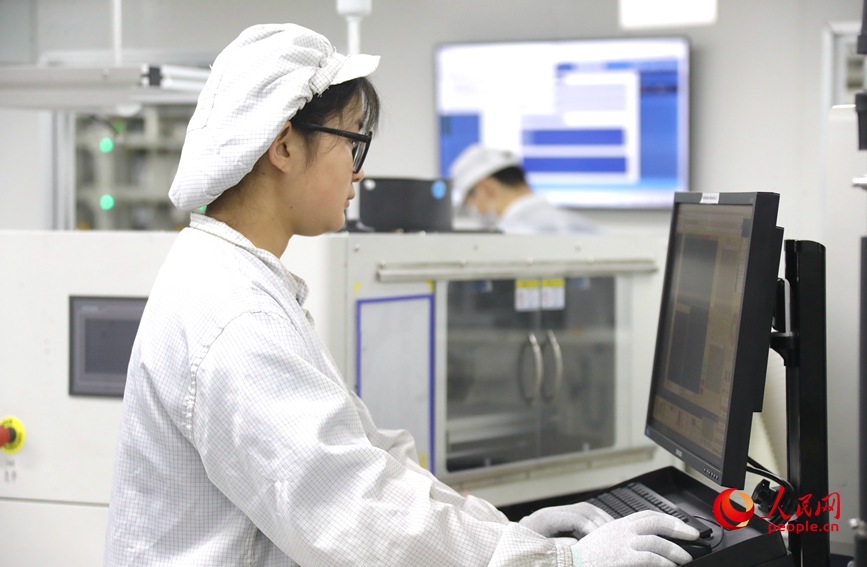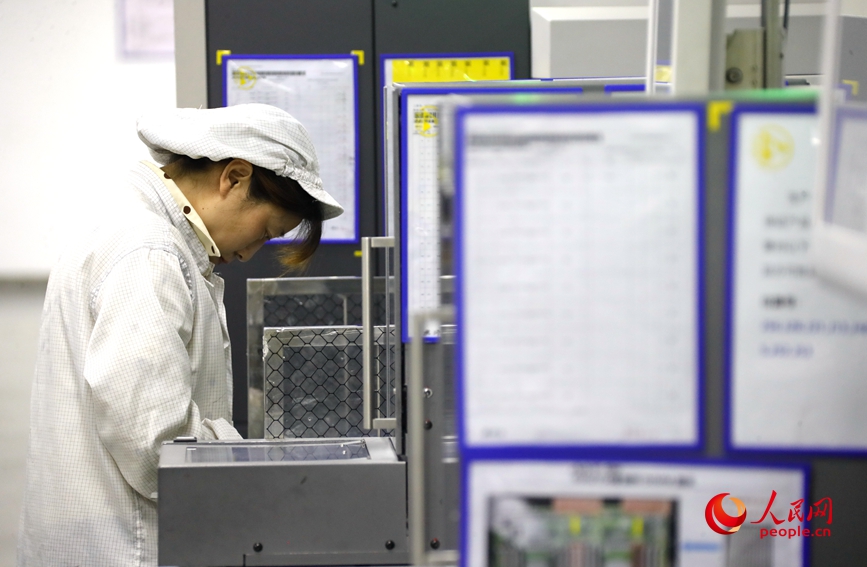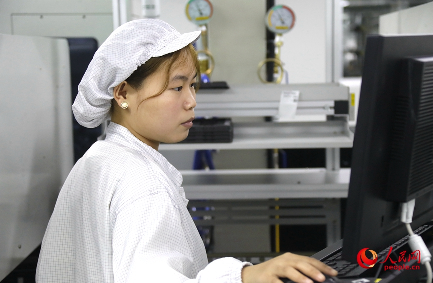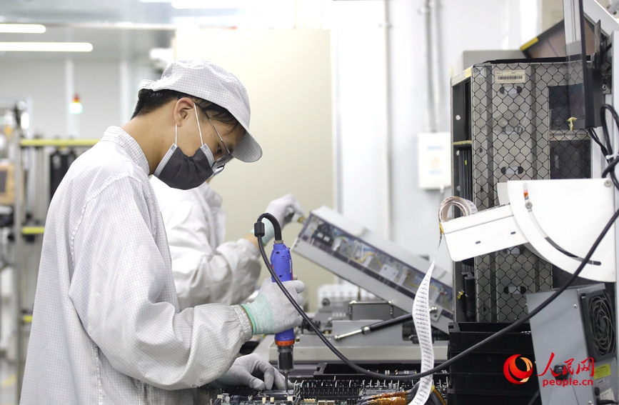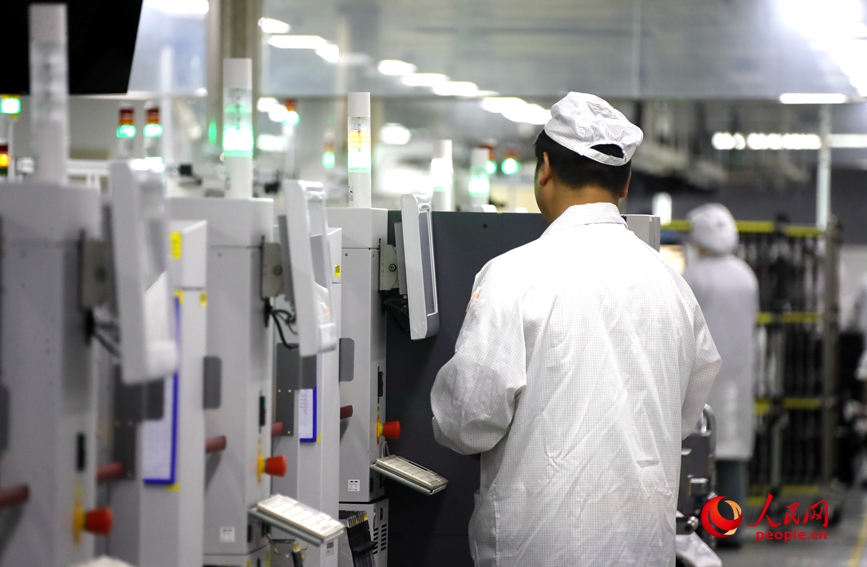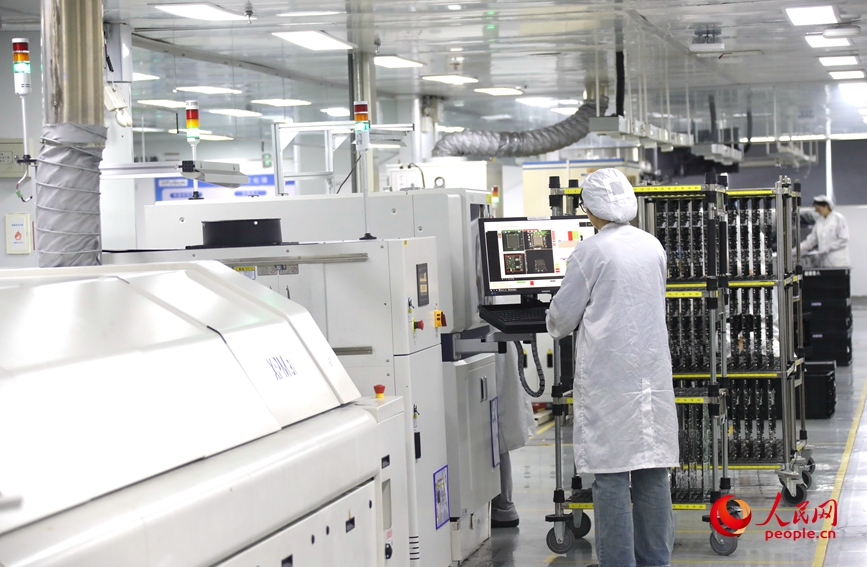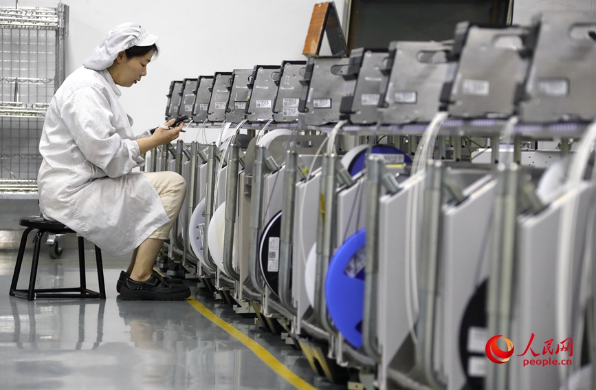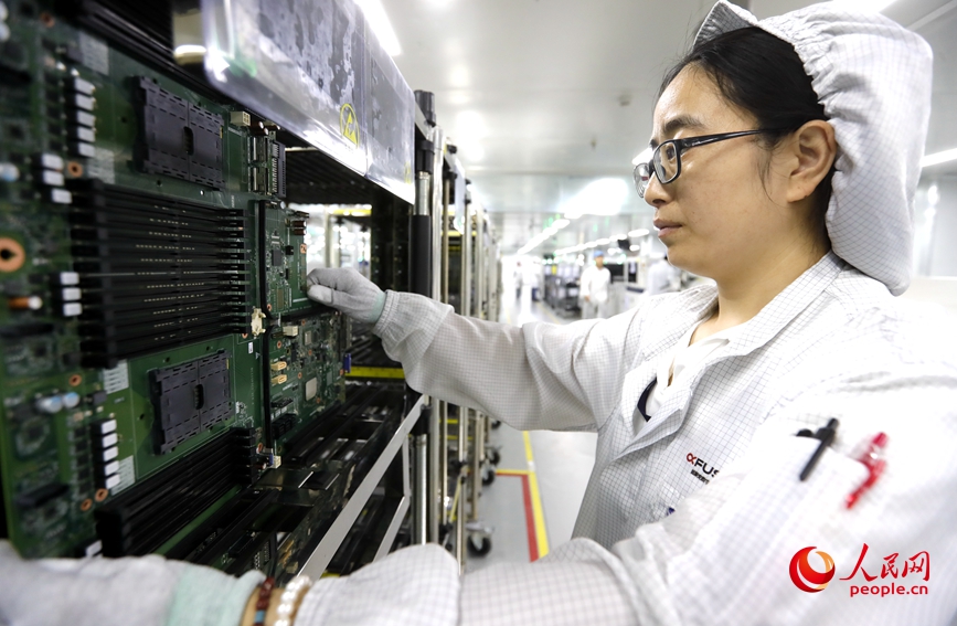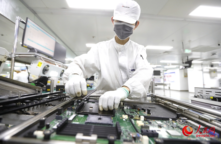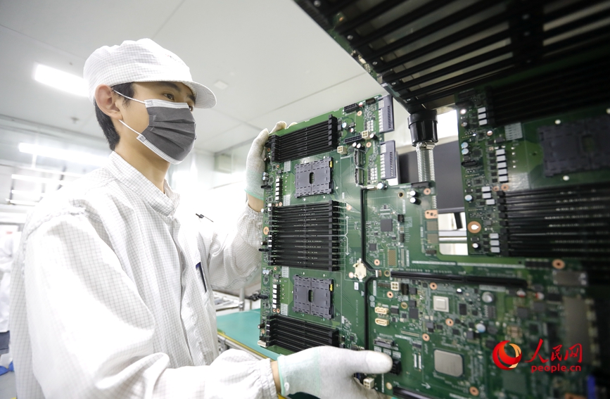 6月12日,位于河南郑州航空港区的超聚变华中制造基地整机生产线上,工作人员正在进行组装、测试、整机预加工。人民网 霍亚平摄