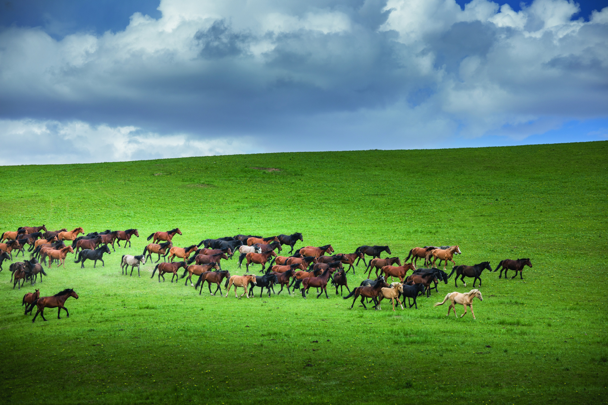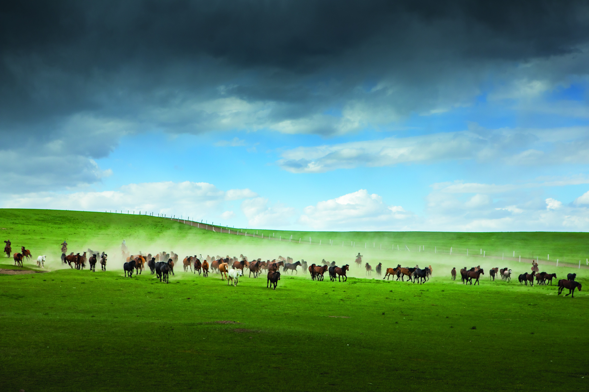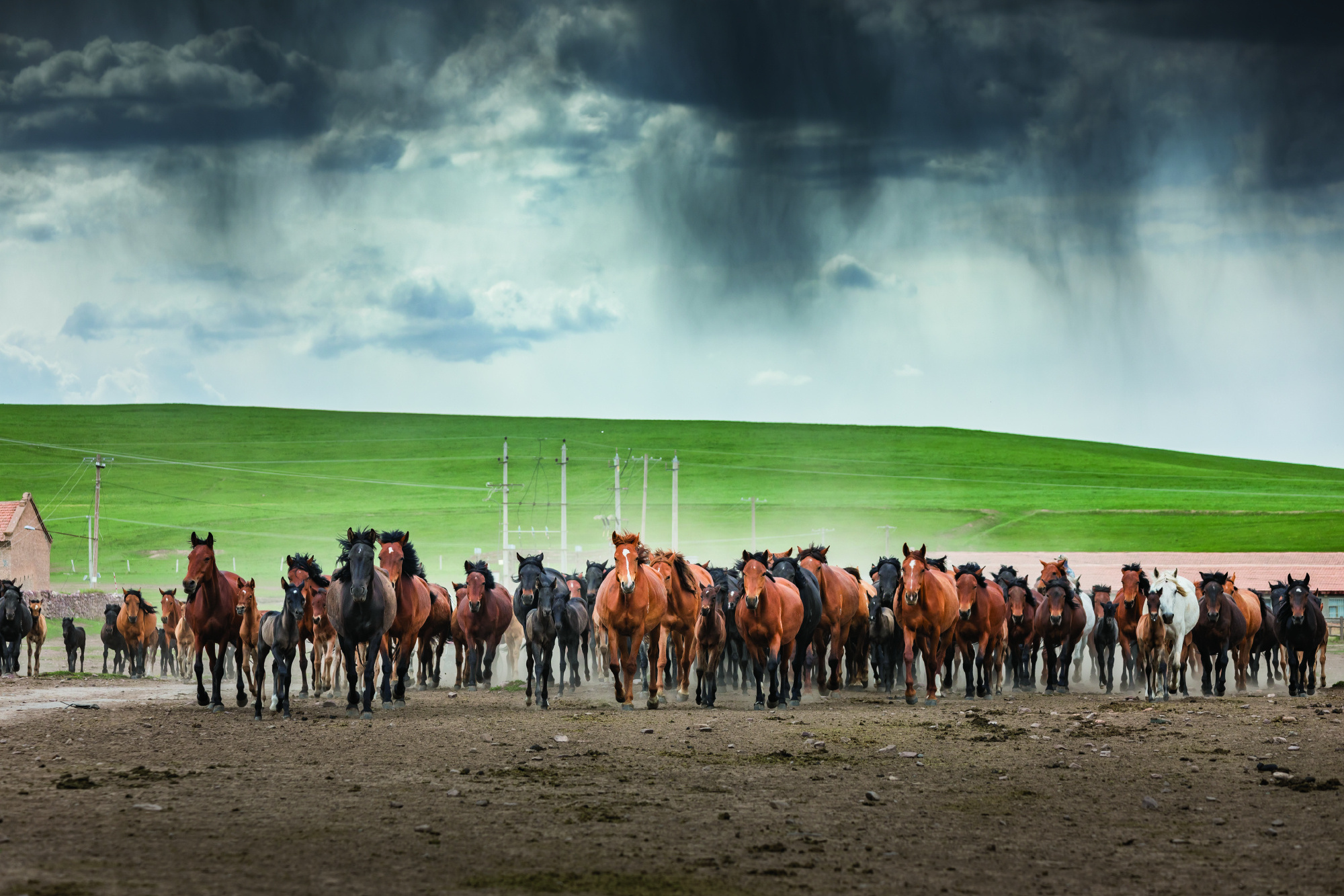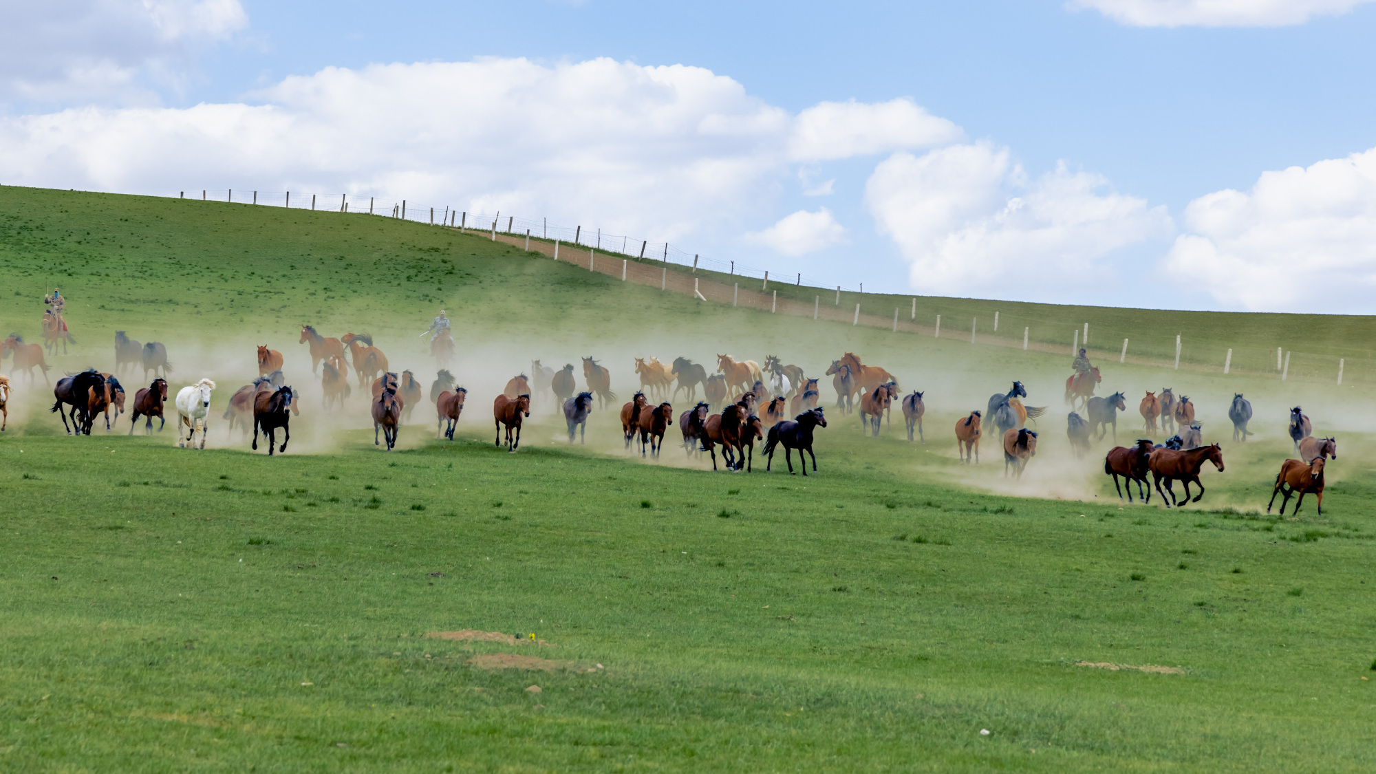 甘肃张掖,祁连山北麓的马场骏马奔腾。碧蓝的天空,辽阔的草原,马蹄卷起飞扬的尘土,每一帧都美得如在画中。