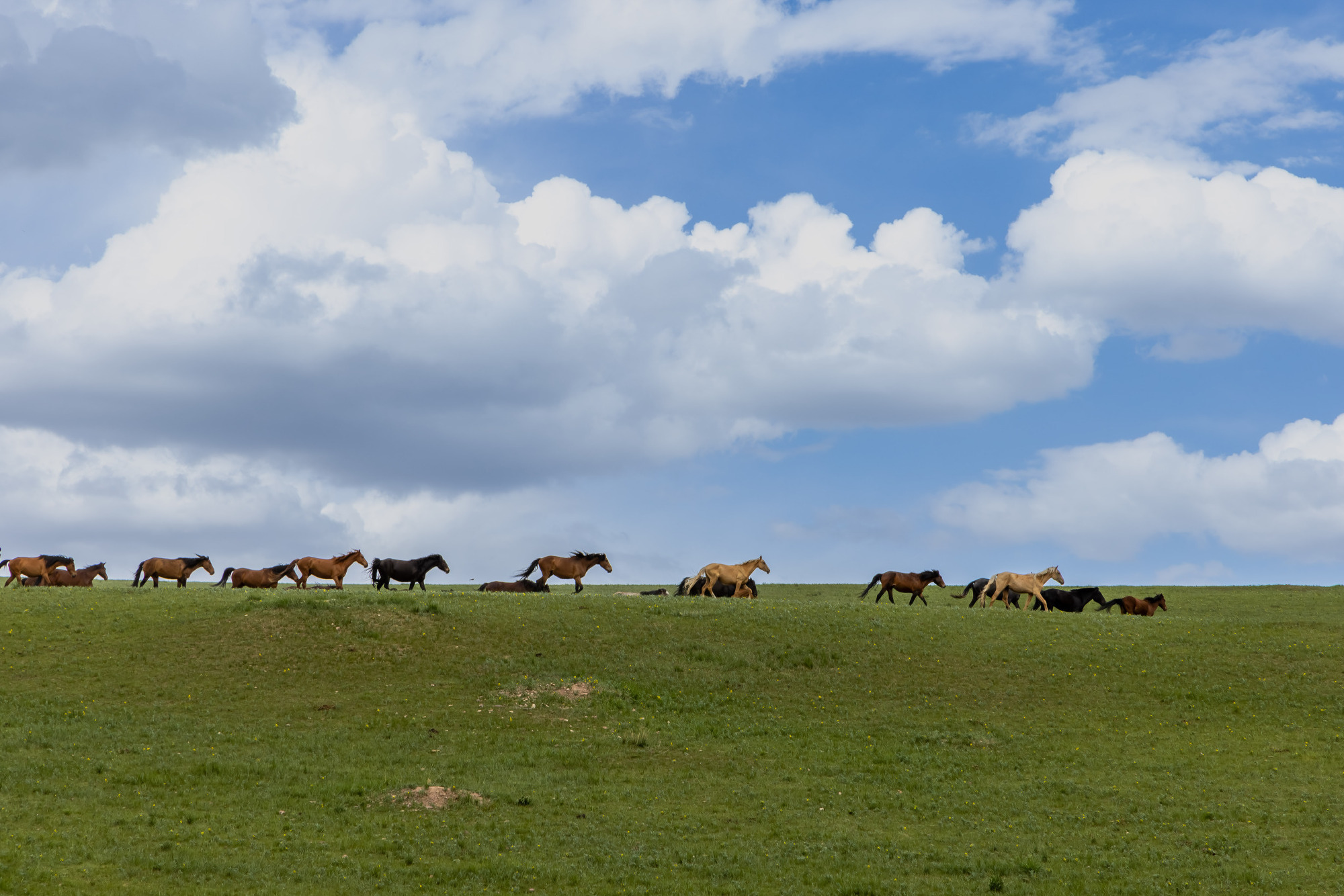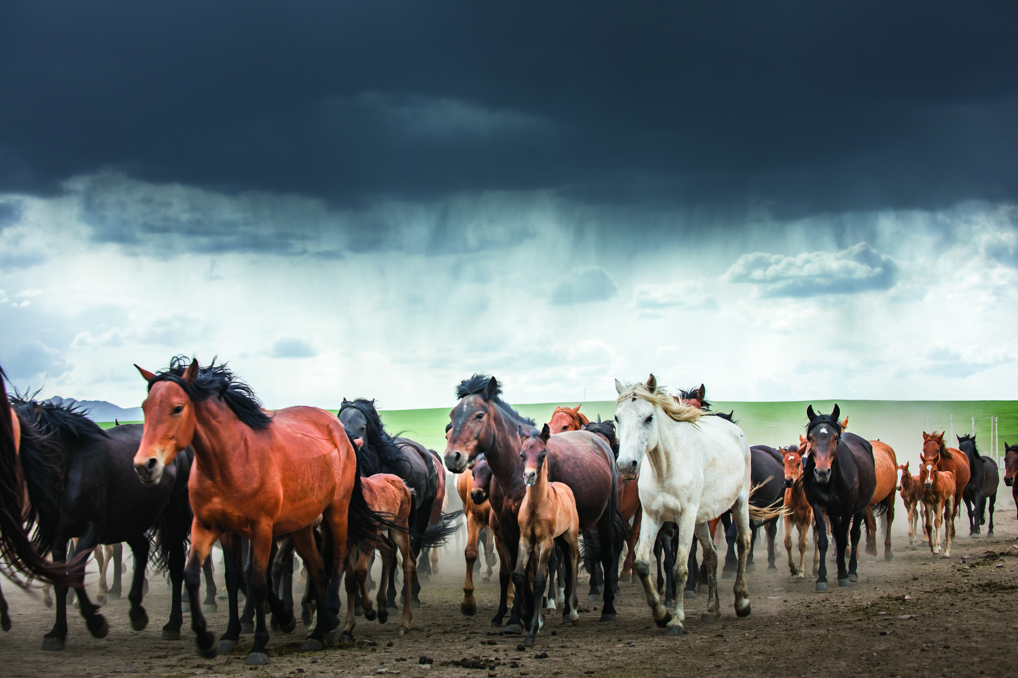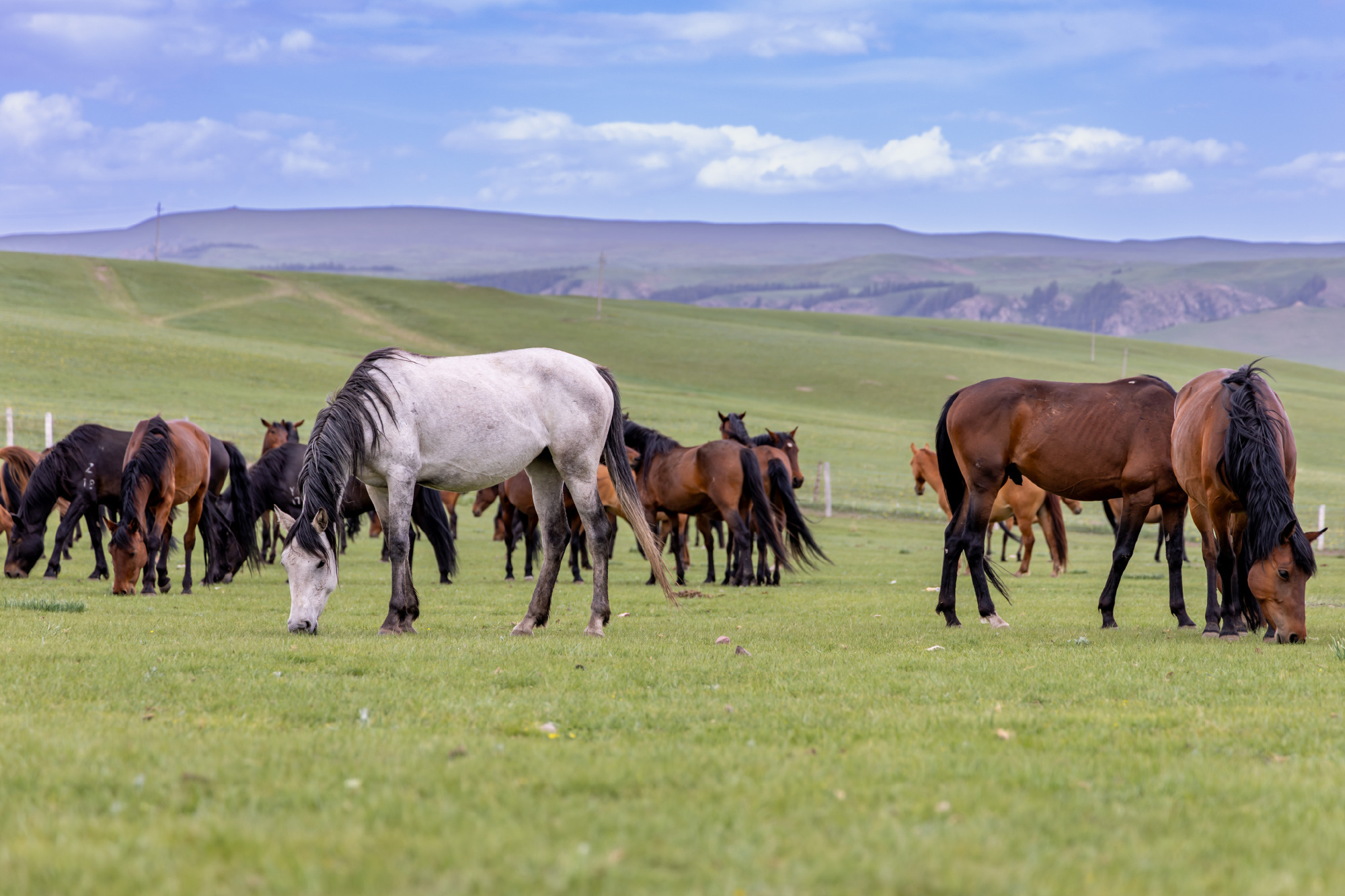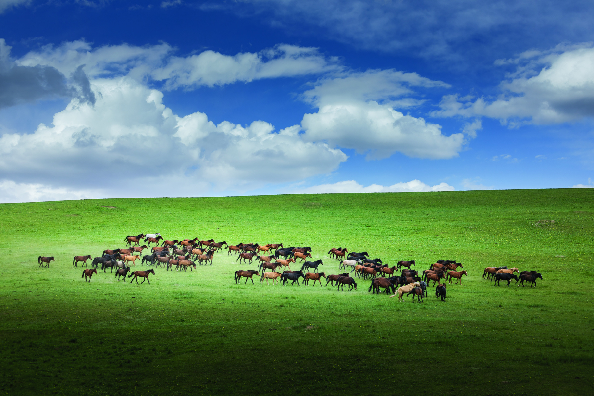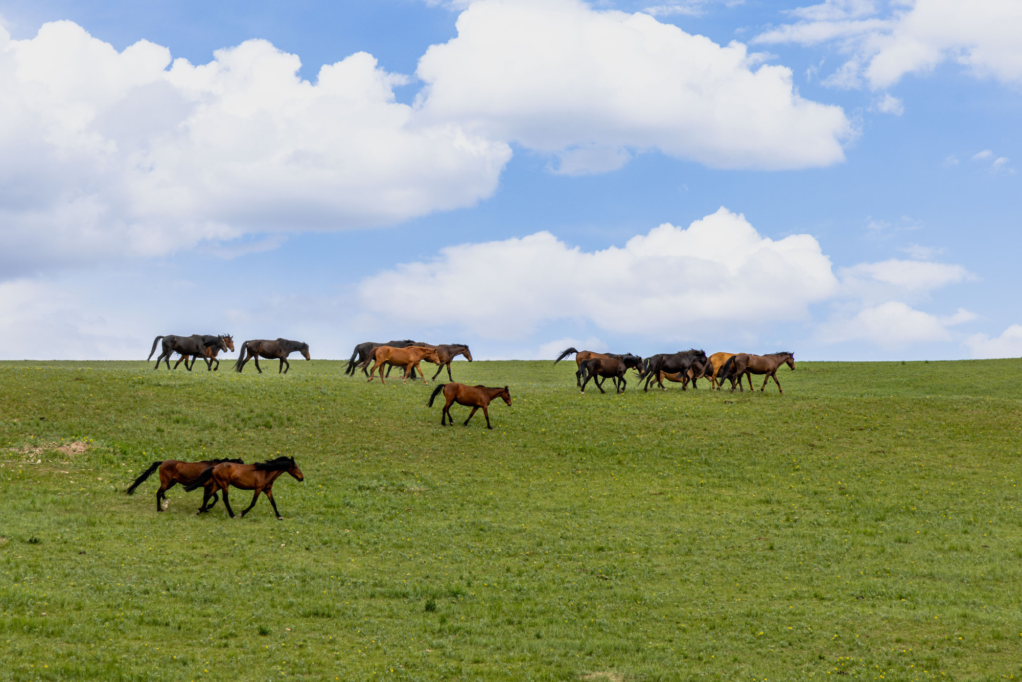 甘肃张掖,祁连山北麓的马场骏马奔腾。碧蓝的天空,辽阔的草原,马蹄卷起飞扬的尘土,每一帧都美得如在画中。