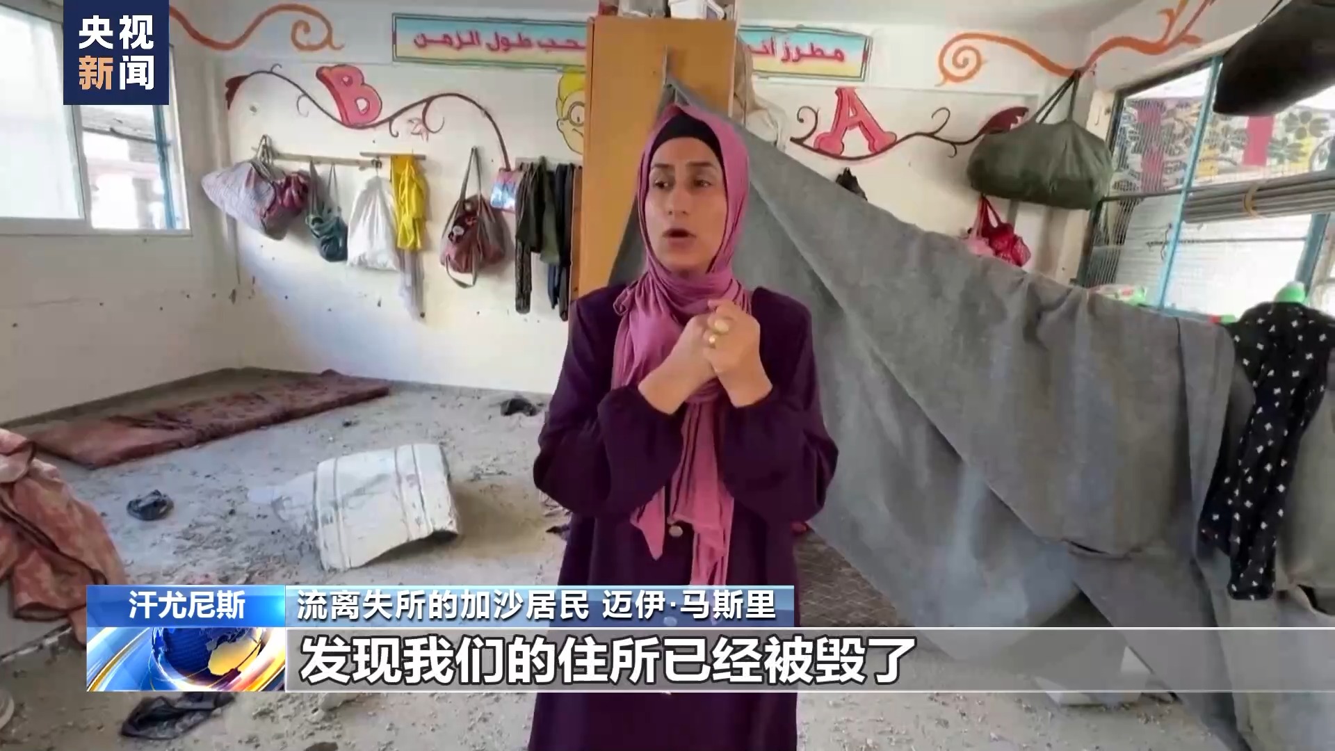流离失所的加沙居民 迈伊·马斯里:我抱着我的儿子,他在尖叫,我的女儿也在尖叫,孙女也在尖叫,我们不知道发生了什么。我和我丈夫一边抱着年龄小的孩子,一边叫醒其他孩子,当时孩子们都睡着了,他们问发生了什么,我告诉他们发生了爆炸,我的小儿子被吓坏了,一动也不敢动,这一切都让人无助。整个学校都是奔跑和尖叫的人群,我们离开时几乎衣不遮体,除了孩子,我什么都没有带,当我回来时,发现我们的住所已经被毁了。