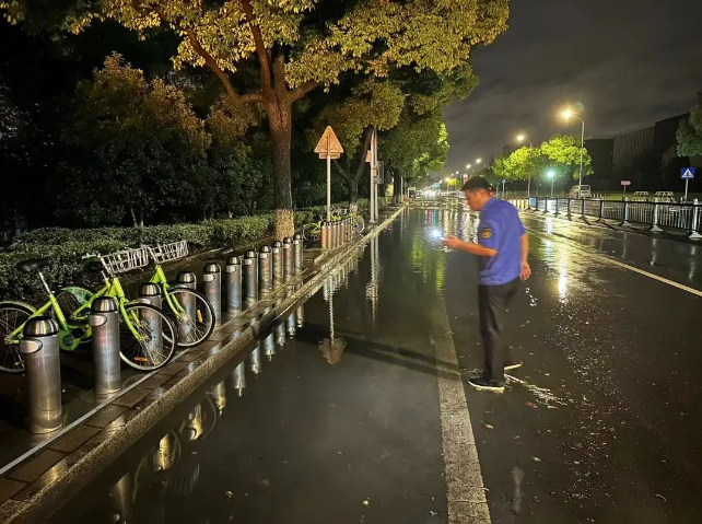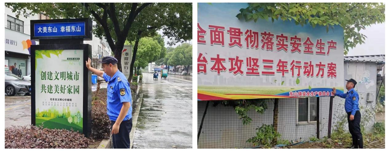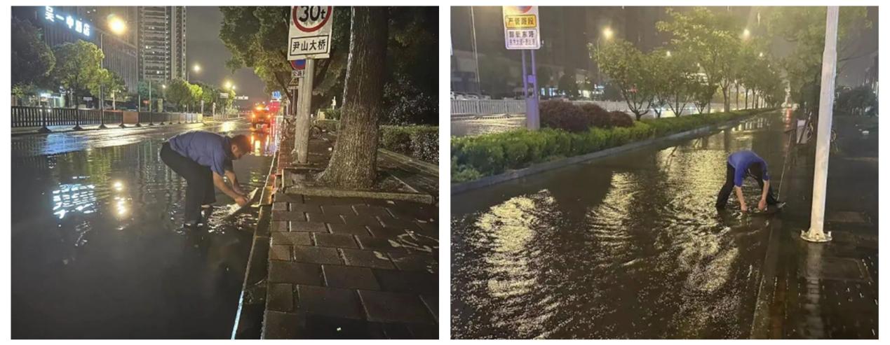 东山镇综合行政执法局在多个重要路口、易积水区域各安排2-3名队员值班值守,警示疏导过往群众,做好安全防范;夜间密切关注积水状况,提前检查排水系统,不间断巡查清除杂物,保障排水通畅。