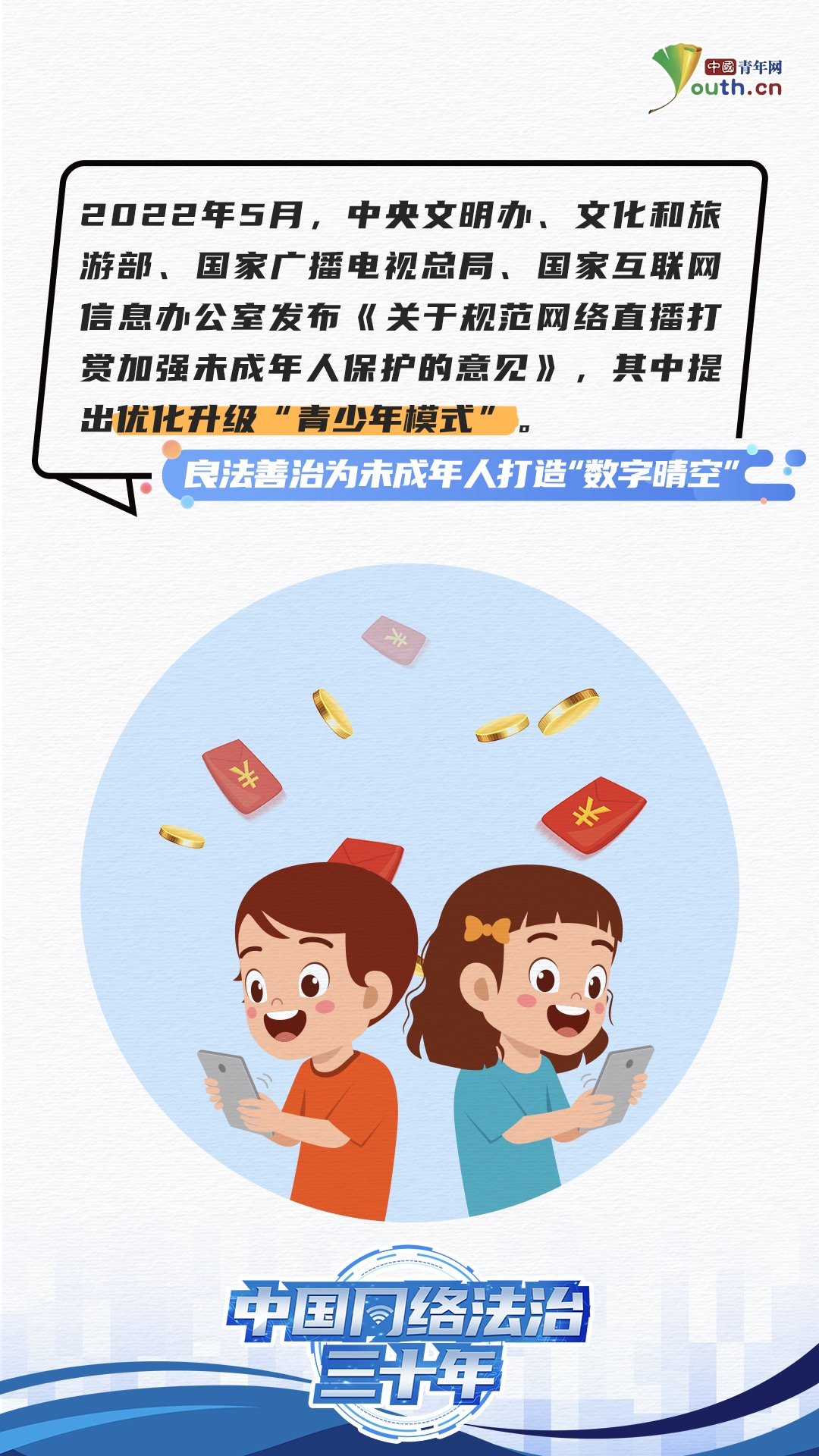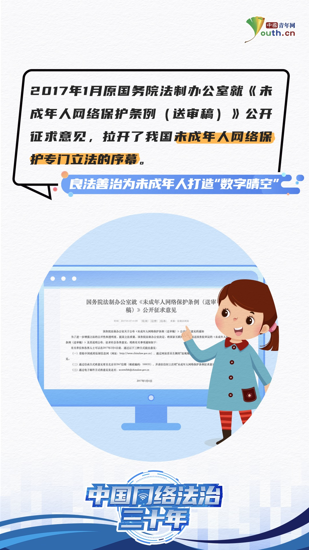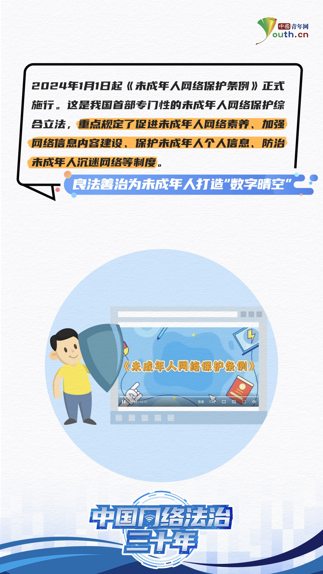 国家网信办副主任王崧在会上表示,2024年是我国全功能接入国际互联网30周年,也是我国网络法治建设起步30周年。“在加强未成年人网络保护方面,我们结合未成年人的特点,对未成年人进行优先保护、特殊保护。注意通过法治手段,加强未成年人网络保护。”王崧提到,近年来,制定《未成年人网络保护条例》《儿童个人信息网络保护规定》,对保护未成年人合法权益作出明确规定,提出明确要求。