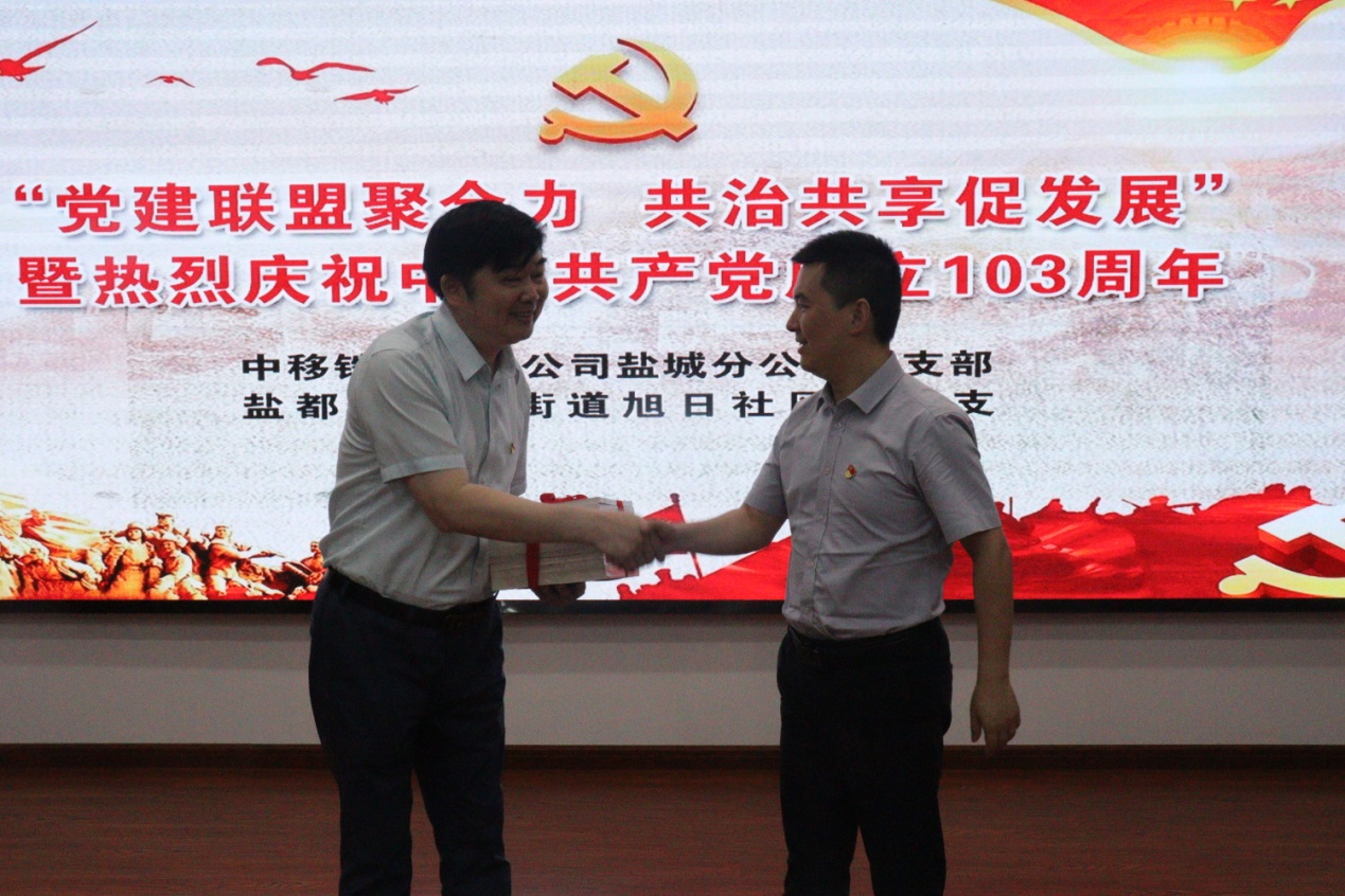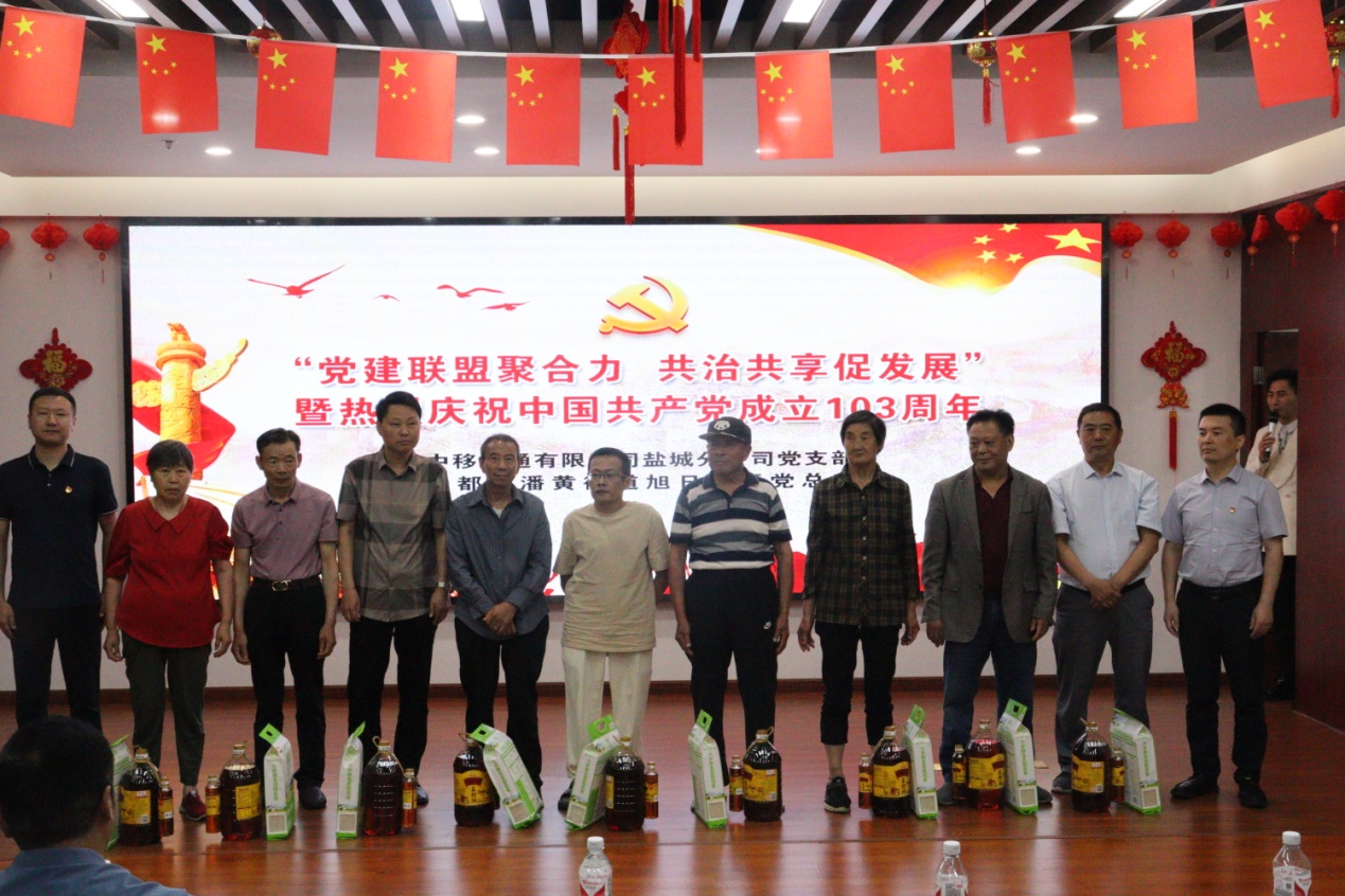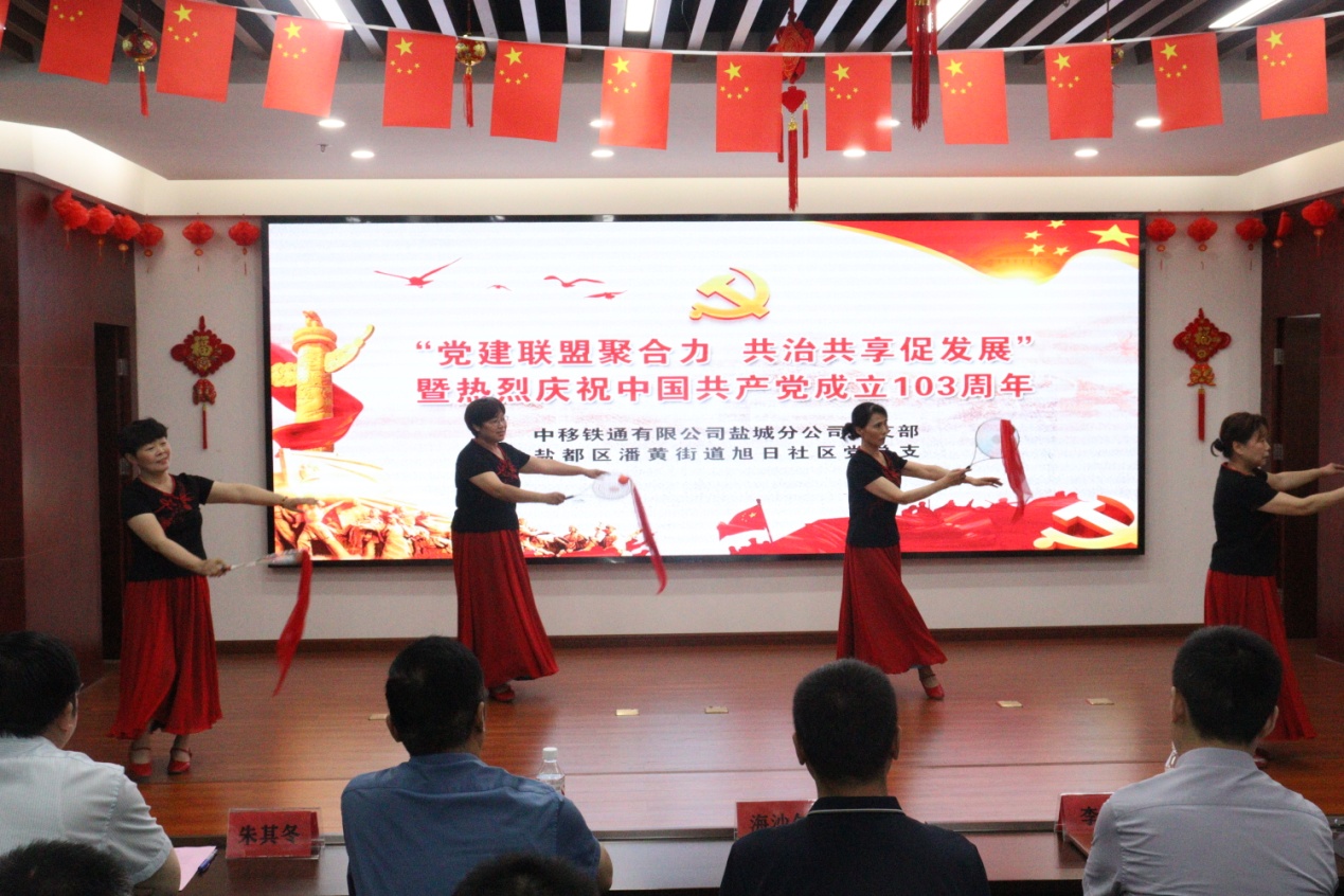 新华报业网讯 为进一步增强党组织的凝聚力、战斗力、创造力,激发广大党员的爱国、爱党热情,中共中移铁通有限公司盐城分公司支部委员会联合中共盐城市盐都区潘黄街道旭日社区总支部委员会共同举办“党建联盟聚合力 共治共享促发展”暨热烈庆祝中国共产党成立103周年主题党日活动。