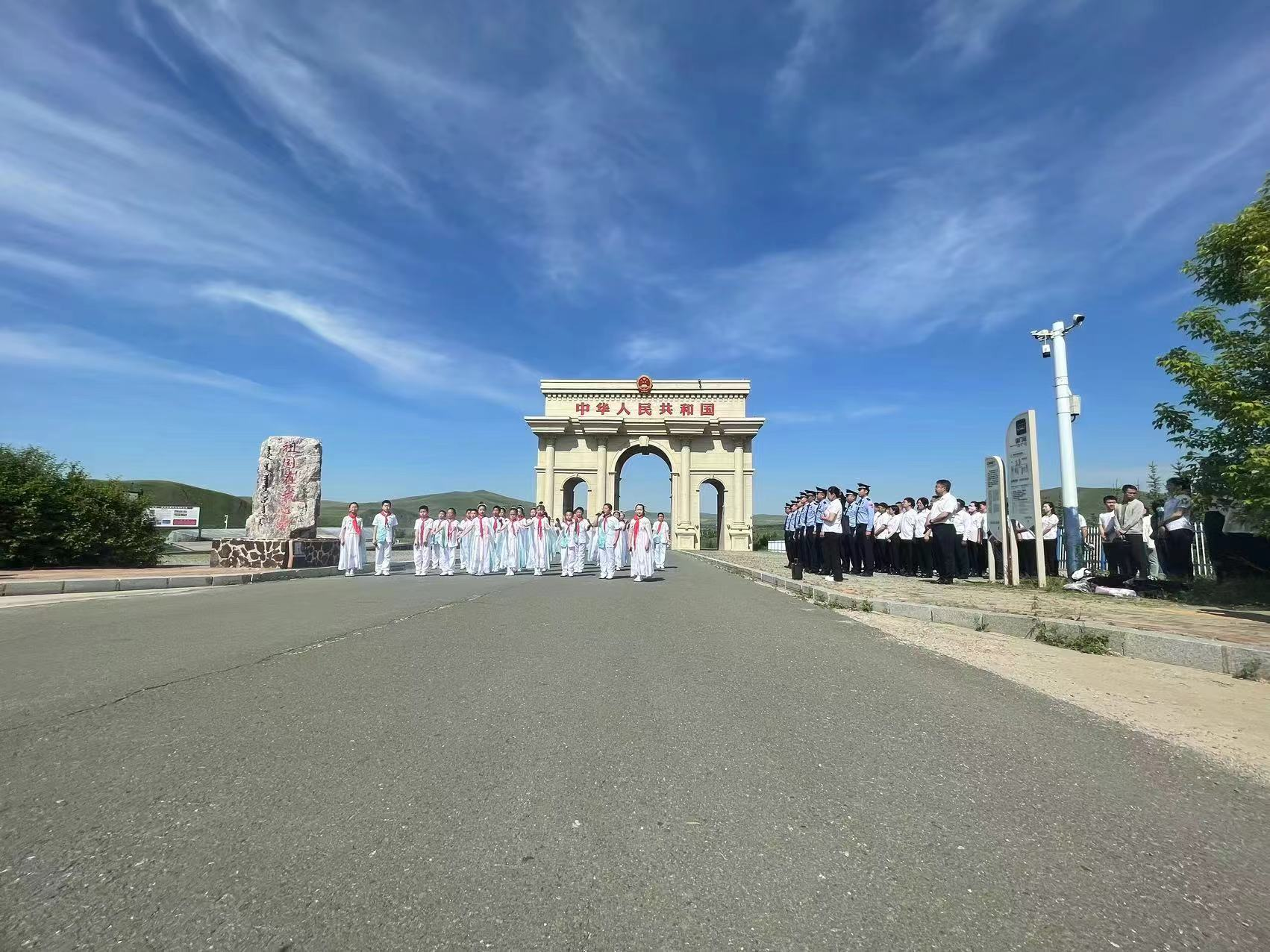 6月26日,“铸牢共同体 中华一家亲”主题宣传活动采访团来到阿尔山口岸。阿尔山市第一小学小学生朗诵的诗词声,回荡在巍巍大兴安岭,响彻阿尔山口岸。“祖国在我心中”,国门前巨石上刻着的这几个大字,在蓝天白云下,熠熠生辉。