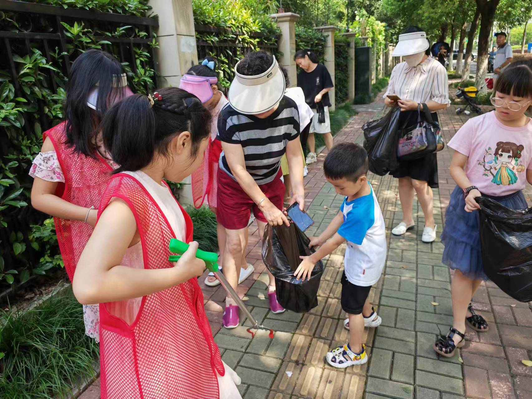 当天,青少年们早早地穿好了红管志愿者马甲,带着垃圾袋、垃圾钳、小铲子等装备集结在星辰北社区新时代文明实践站。孩子们两两结对,沿着太阳星辰花园二区、四区两个小区主干道及商业街一路捡拾垃圾。大家仔细查看着道路两旁及绿护带里的垃圾纸屑、塑料袋、烟头等,一个不漏地将垃圾夹起;看到路边张贴的小广告,小心翼翼地用铲子将其刮下,以免破坏墙皮。炎炎烈日下,孩子们没有叫苦叫累,反而一路欢声笑语,活力满满。绕小区一周后,大家回到出发地点,共同将捡到的垃圾投入了分类垃圾桶中。参与活动的丁子夏小朋友说:“平时路过也不会发现这么多垃圾,现在才发现,那些绿化带里藏了好多废旧卡片、零食包装袋,我们以后吃完零食一定不能随地乱扔!”