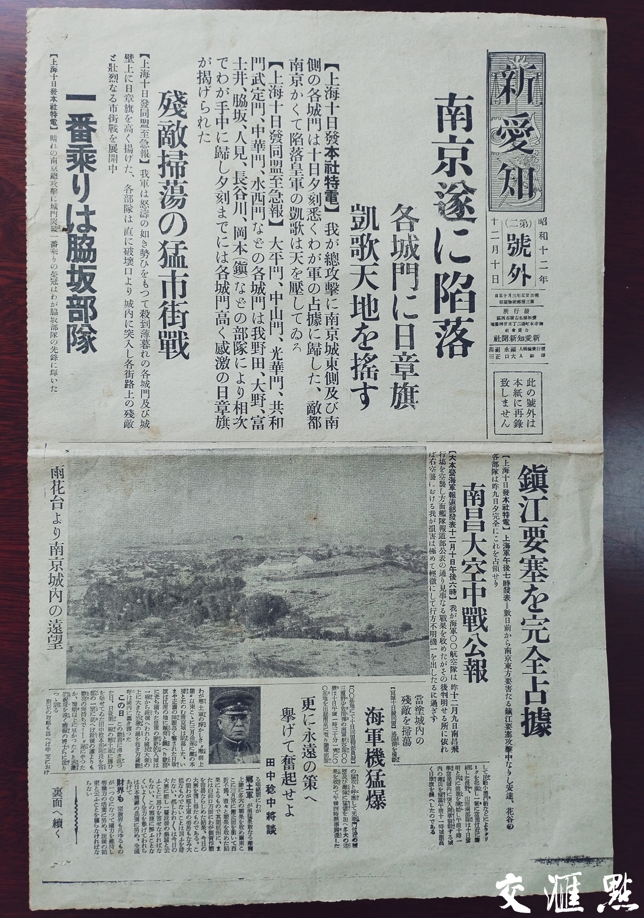 在这批捐赠史料中,一份1937年12月10日日本新爱知新闻社发行的《新爱知》号外,长410毫米,宽265毫米,正反两面;头版正上方报道了日军占领南京的新闻,下方正中间刊登的是日军占领雨花台后拍摄的远望南京城的照片,再一次证明了当年日军侵华的罪行。