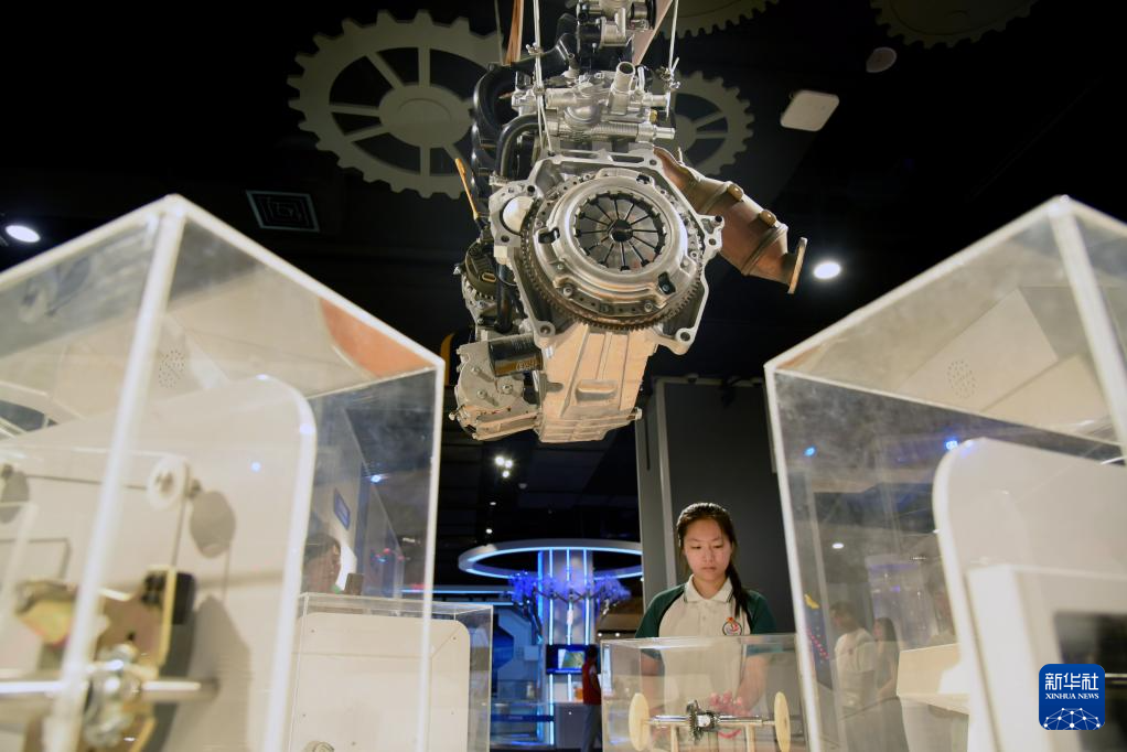 7月7日,一名中学生在山东省枣庄市科技馆了解内燃机工作原理。暑假期间,孩子们参加丰富多彩的活动,乐享假日时光。新华社发(刘明祥摄)