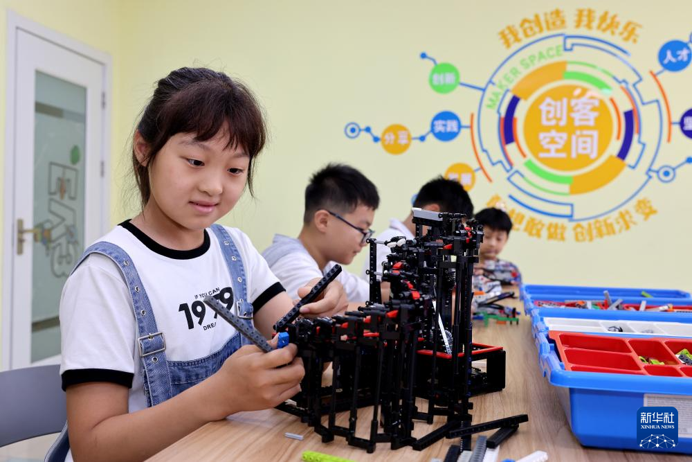 7月7日,学生在山东省枣庄市科普基地学习组装机器人。暑假期间,孩子们参加丰富多彩的活动,乐享假日时光。新华社发(孙中喆摄)