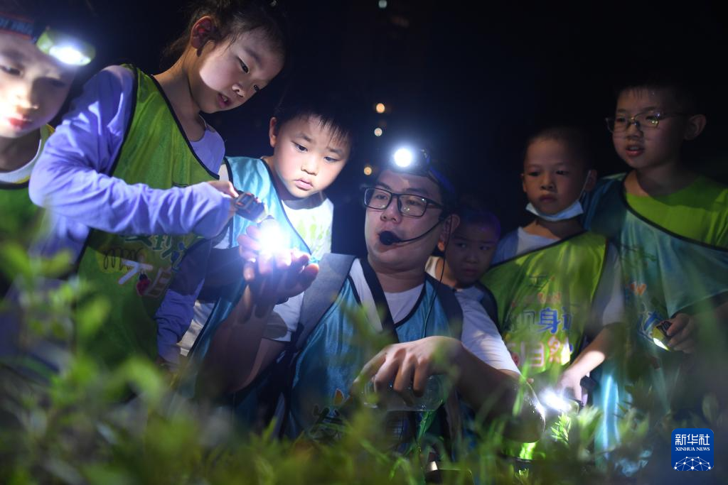 7月6日晚,在武汉市颐湖公园,孩子们在自然导师带领下夜观昆虫。暑假期间,孩子们参加丰富多彩的活动,乐享假日时光。新华社发(周超摄)