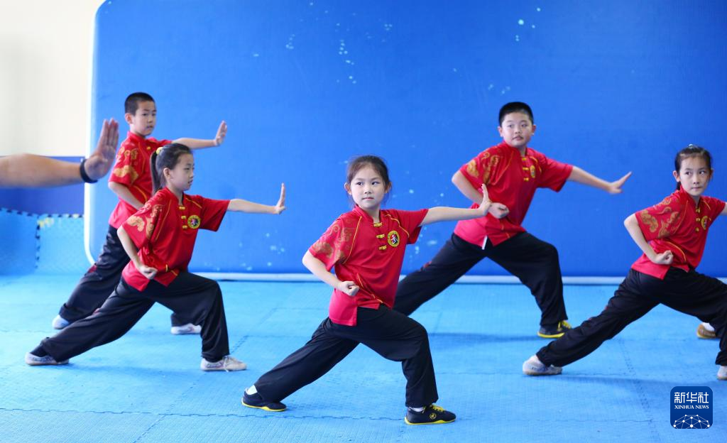 7月7日,孩子们在山东省滕州市一家武术培训机构学习武术。暑假期间,孩子们参加丰富多彩的活动,乐享假日时光。新华社发(李志军摄)