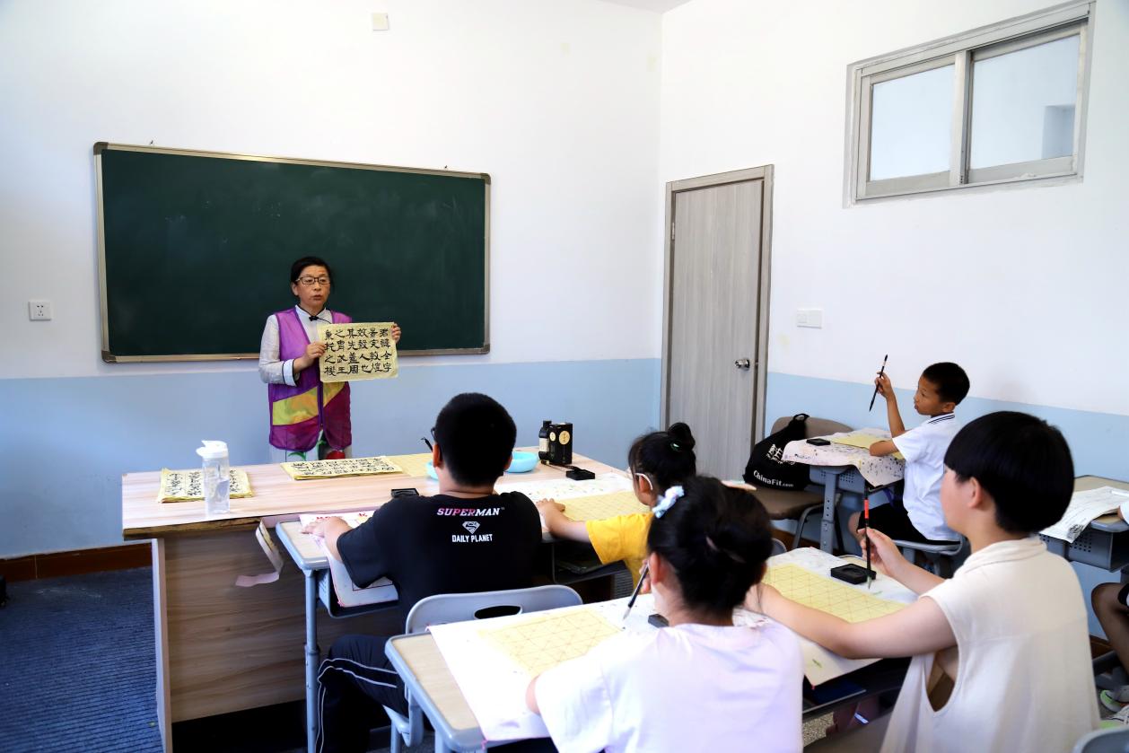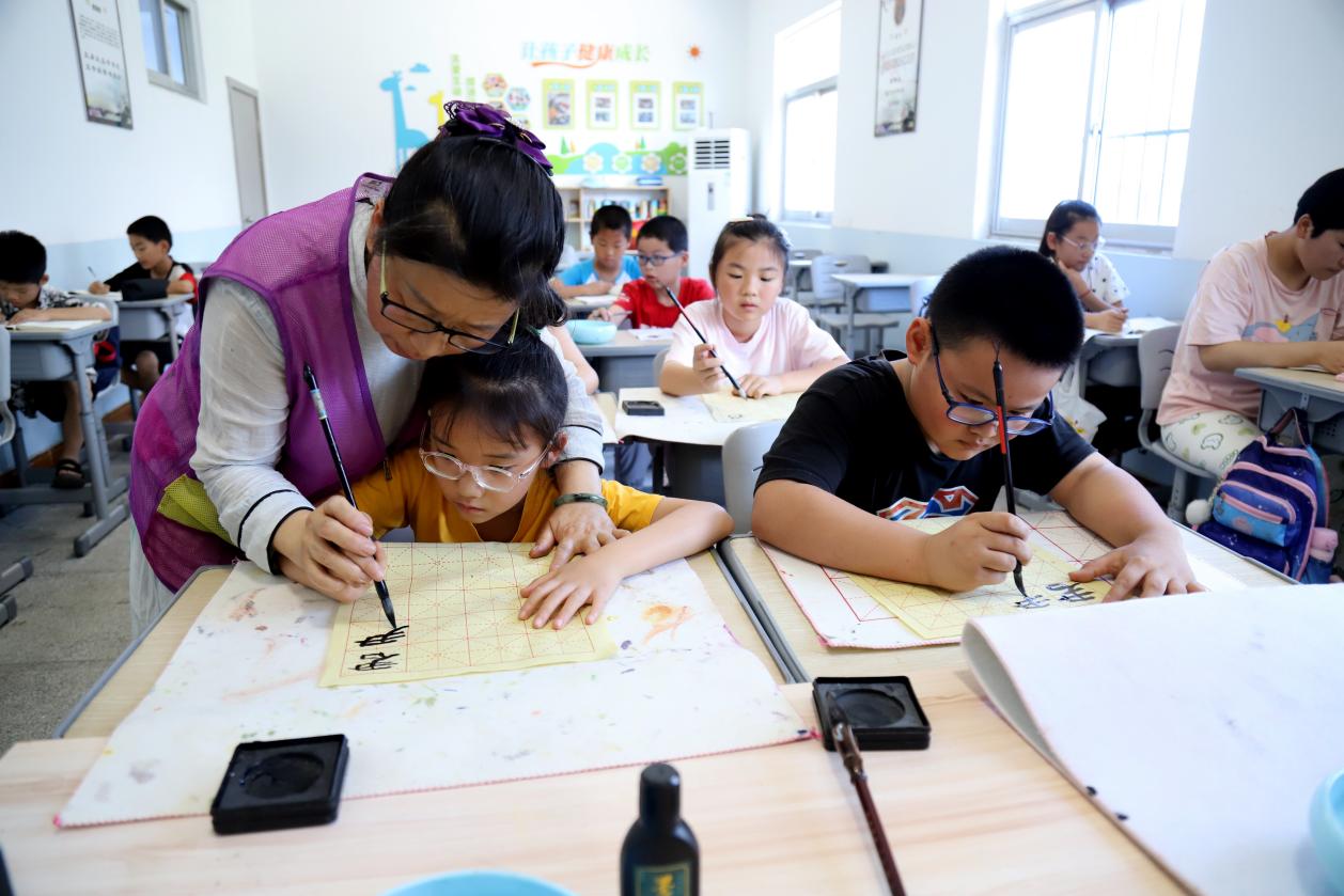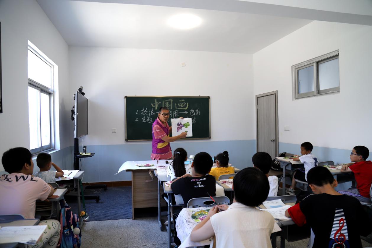 7月8日,在高淳区桠溪街道定埠村公益辅导班内,小学生正在志愿者老师辅导下学习书法和绘画课程。