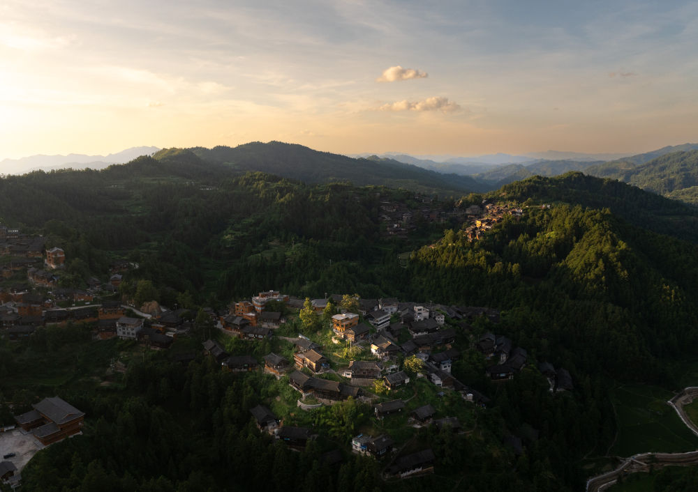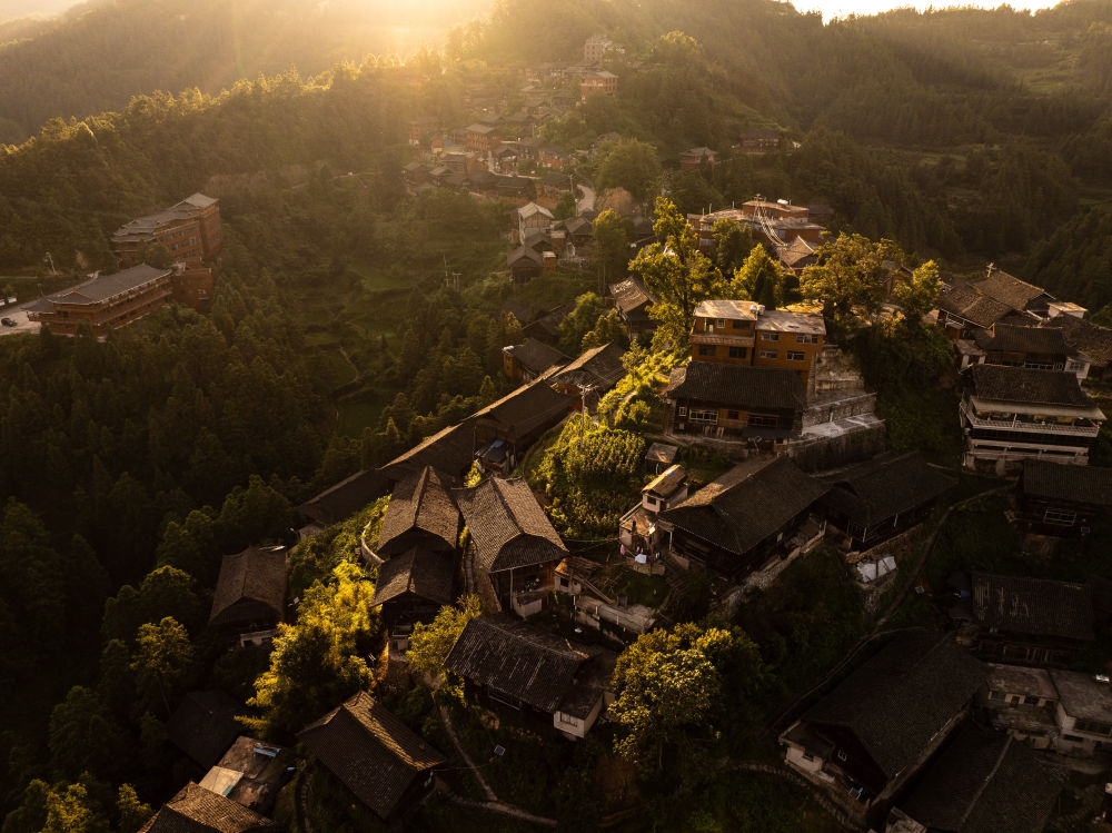 日落时分,晚霞将控拜村染成金黄色(7月10日摄,无人机照片)。