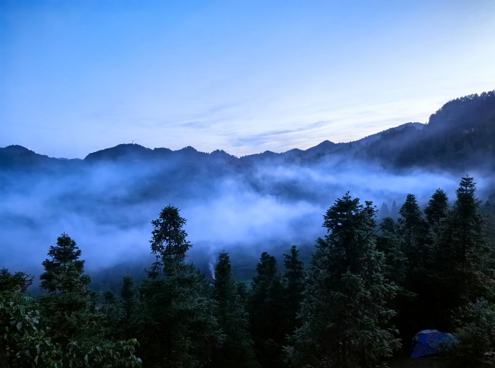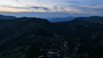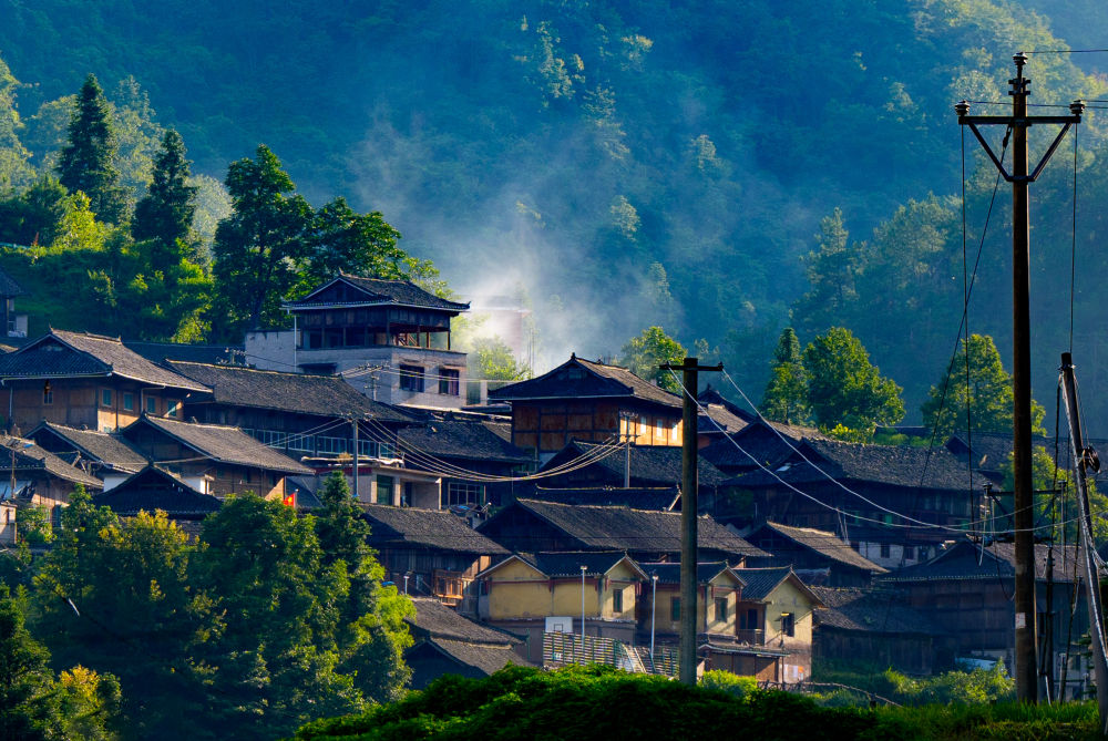 日落时分,控拜村的山谷中飘起阵阵炊烟(7月10日摄)。