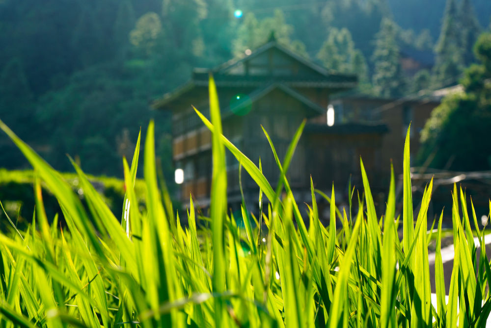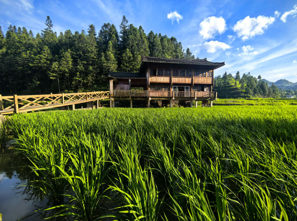 控拜村的传统民居和稻田相得益彰(7月10日摄)。