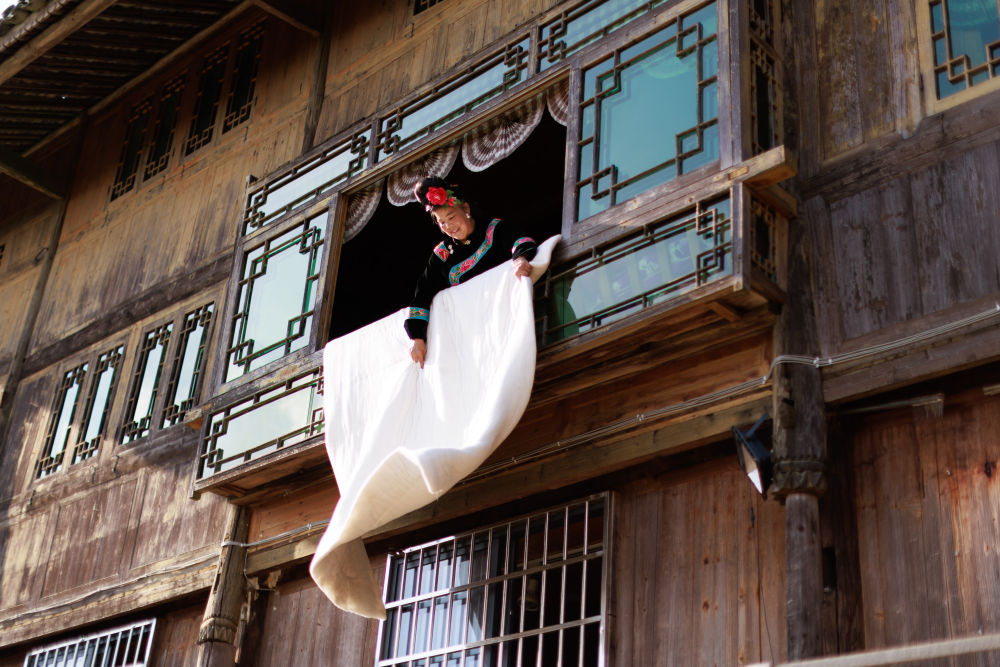 控拜村村民杨通英在晾晒棉被(7月10日摄)。