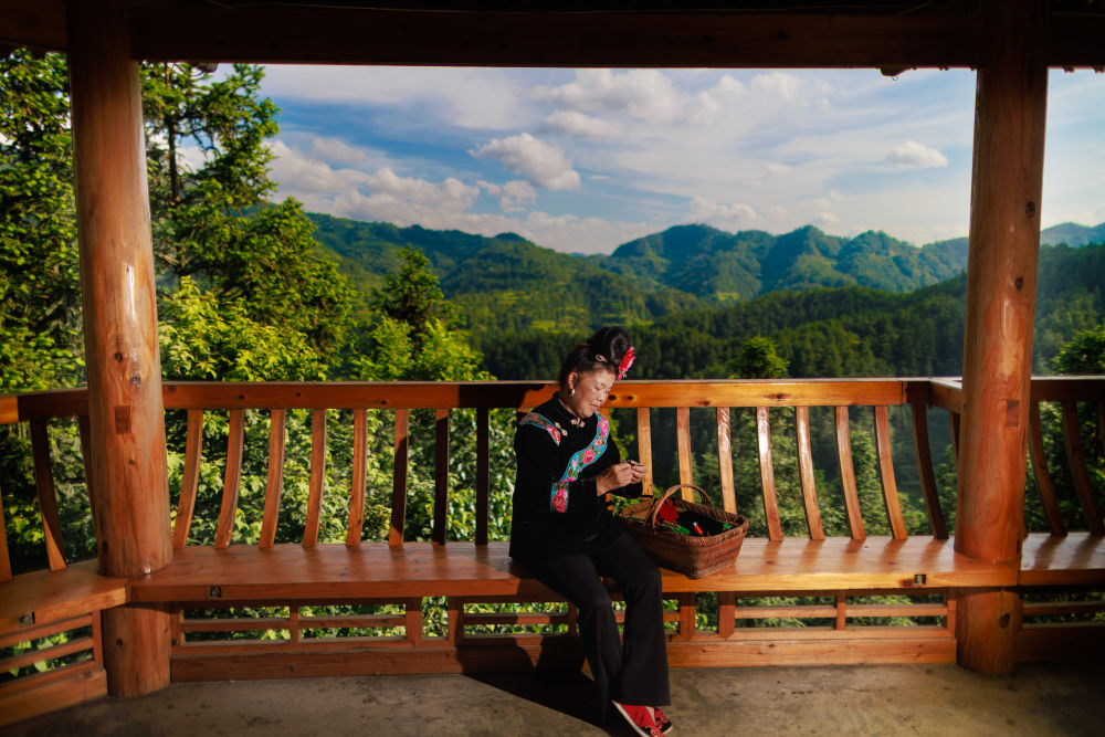 控拜村村民杨通英在自己家的凉亭内缝制苗族服饰(7月10日摄)。