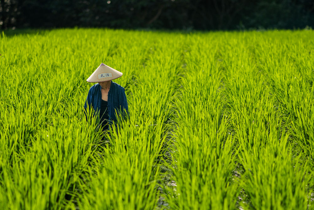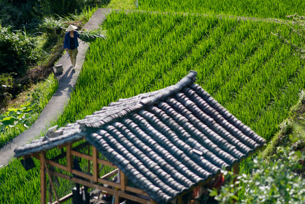 控拜村村民龙泽录在稻田中劳作(7月10日摄)。
