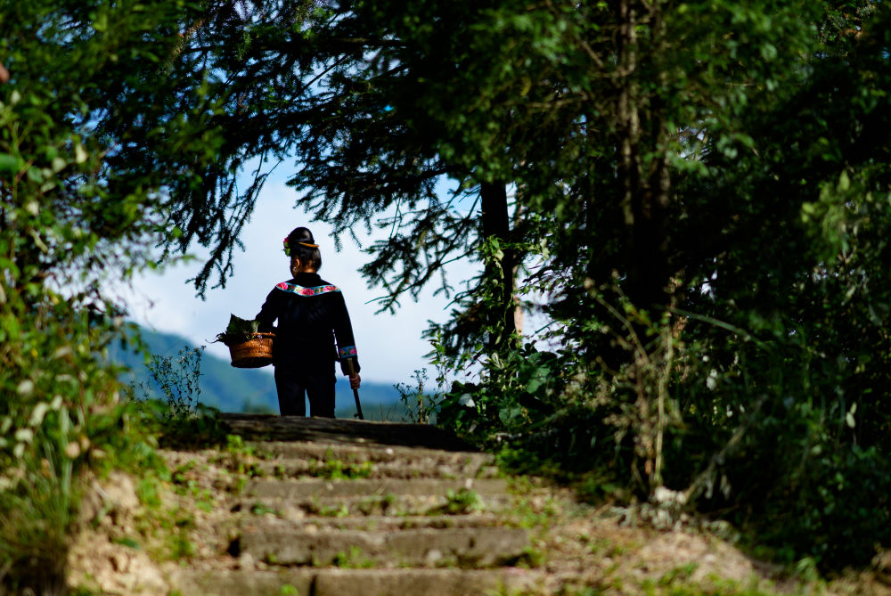 控拜村村民杨通英走在村中的树林里(7月10日摄)。