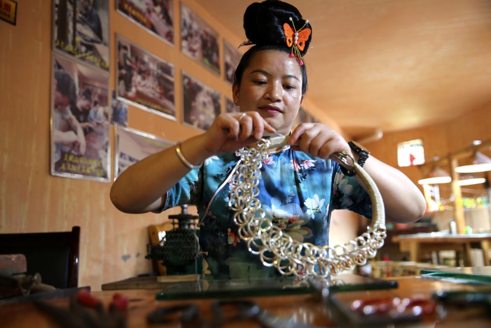 控拜村村民王红梅在制作银项圈(7月10日摄)。新华社发(余天英 摄)
