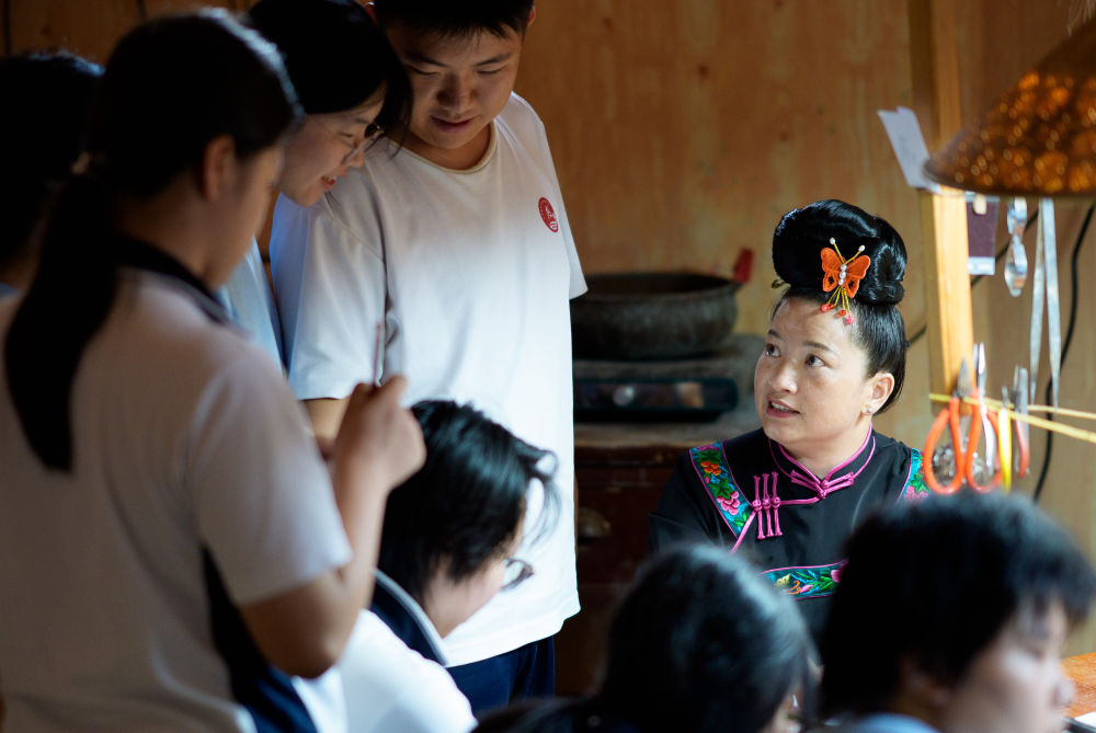 控拜村村民王红梅(后排右)在为前来研学的高中生讲解银饰制作知识(7月10日摄)。