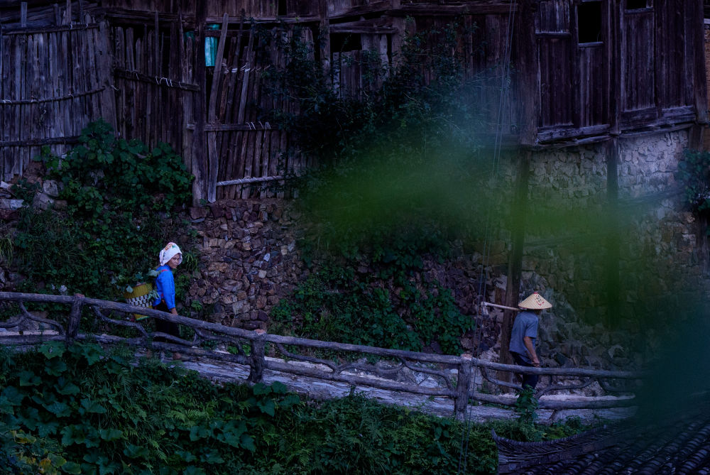 日落时分,控拜村村民毛榜金(左)、穆仕建在结束了一天的劳作后回到村子里(7月10日摄)。