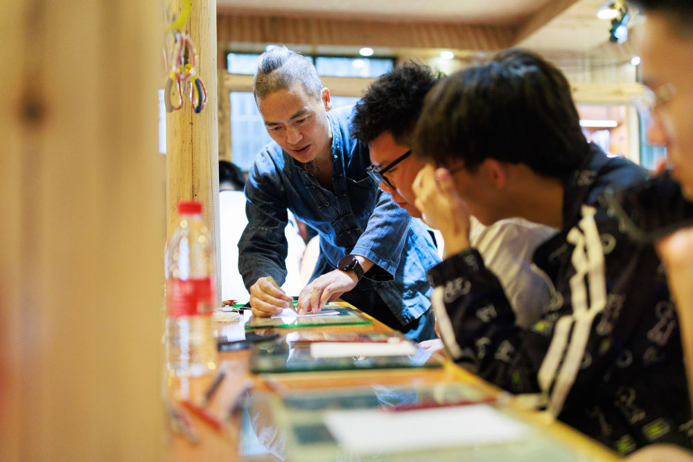 控拜村村民龙太阳(左一)在为前来研学的高中生讲解银饰制作知识(7月10日摄)。