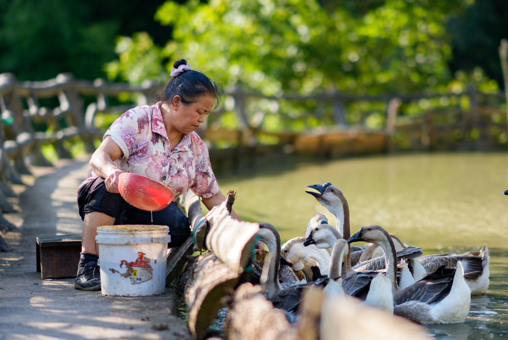 控拜村村民李普桥在给家里养的鹅喂食(7月10日摄)。