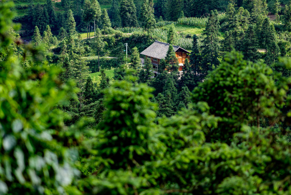 一间传统民居掩映在控拜村的青山绿水中(7月10日摄)。
