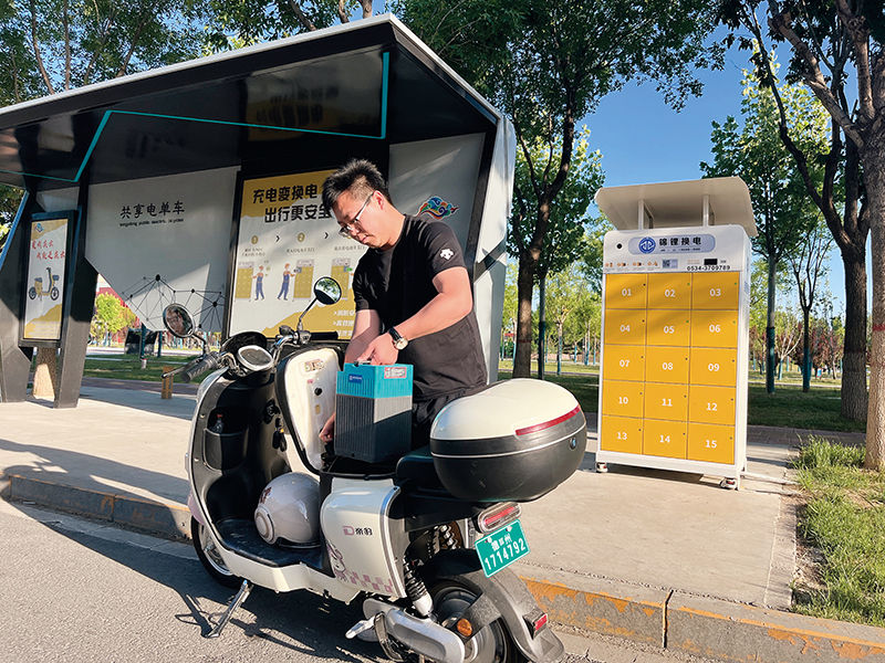 在山东省德州市庆云县,东方名郡小区居民张瑞英正在更换电动自行车电池。《瞭望》新闻周刊记者在现场看到,张瑞英将电动自行车停在小区门口的黄色换电柜旁,手机扫码开柜,将低电量电池放入“小黄柜”,再取出一块电池放入自己的电动自行车,整个过程不到一分钟。
