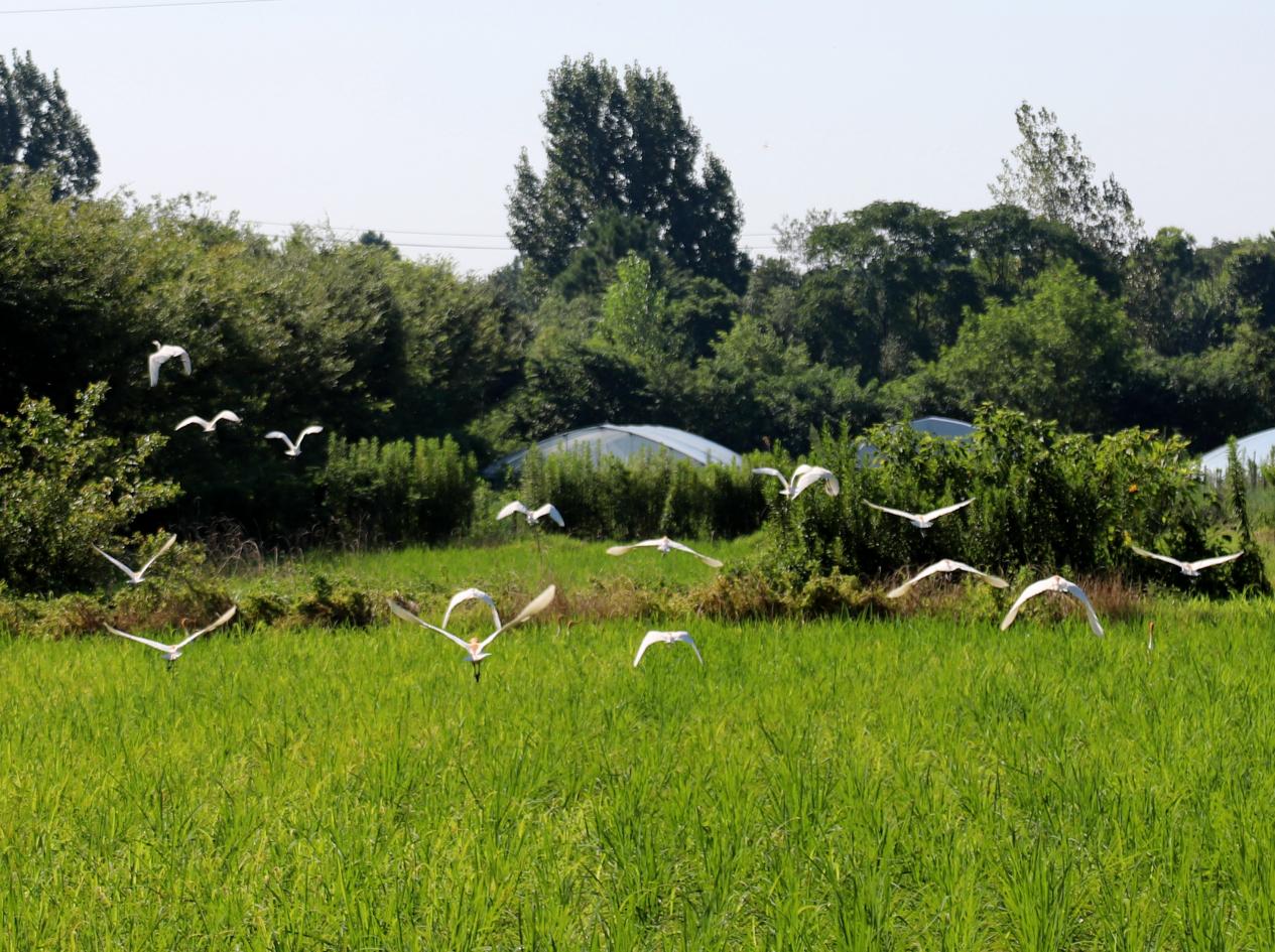 7月22日,在高淳区桠溪街道新墙村一处生态稻田间,呈现成群鹭鸟啄虫、翩翩飞舞的场景。
