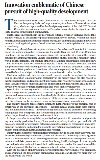 原标题:Innovation emblematic of Chinese pursuit of high-quality development