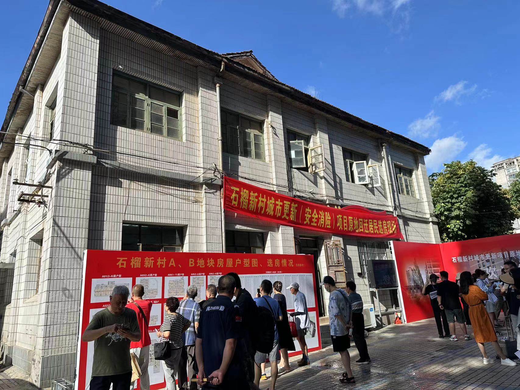 7月25日早晨七点半,位于南京市评事街87号的石榴新村城市更新项目原地回迁居民选房现场已经人头攒动。选房第一天,按计划上午排了45户居民选房。他们从老房迁出已三年多,如今新房已封顶,回迁在即!不少人早早来到现场,热烈地在户型区位图前讨论着,在表格中寻找着自己中意的那个房号。