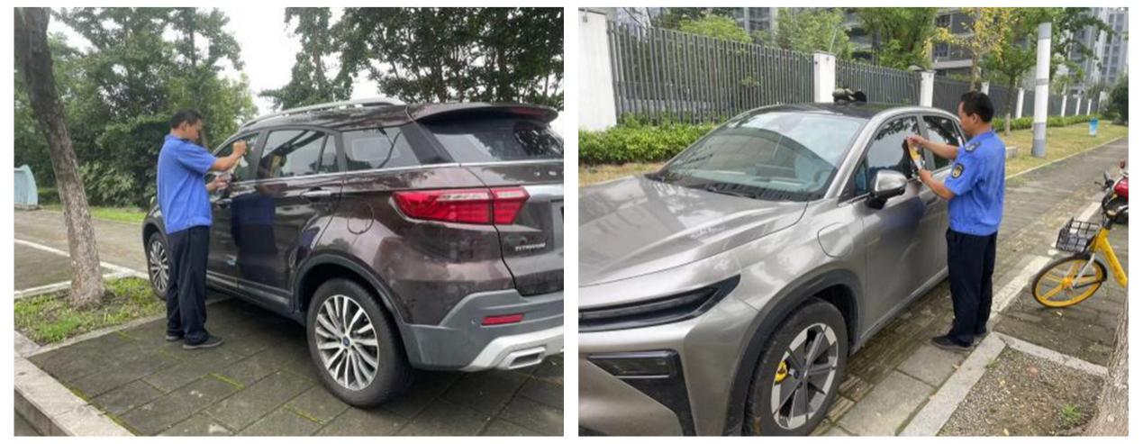 高温“烤验”下,郭巷街道城管队员依然坚守在岗位上,对违规停放的车辆进行拖移,停放到车位。