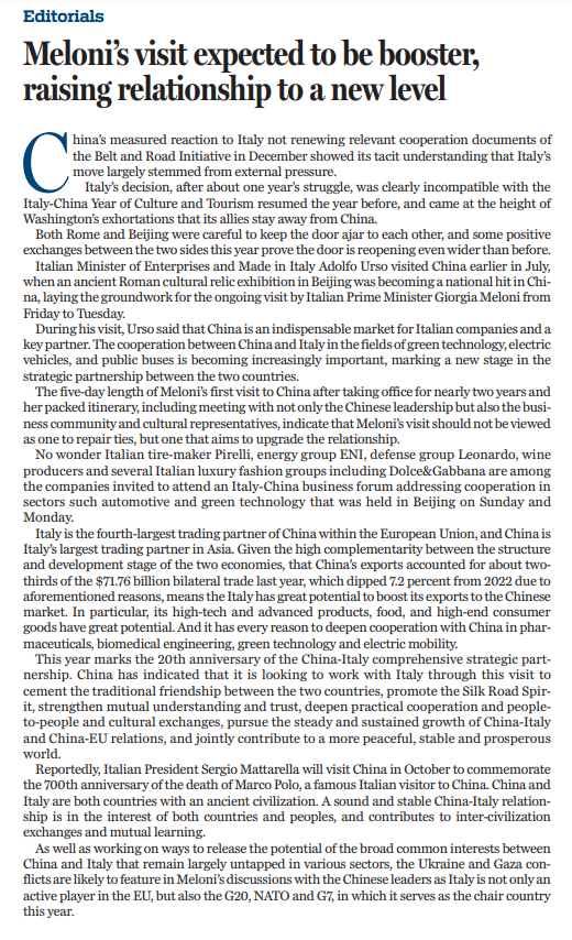 7月27日至31日,意大利总理梅洛尼对中国展开为期五天的正式访问,这也是其任内首次访华。