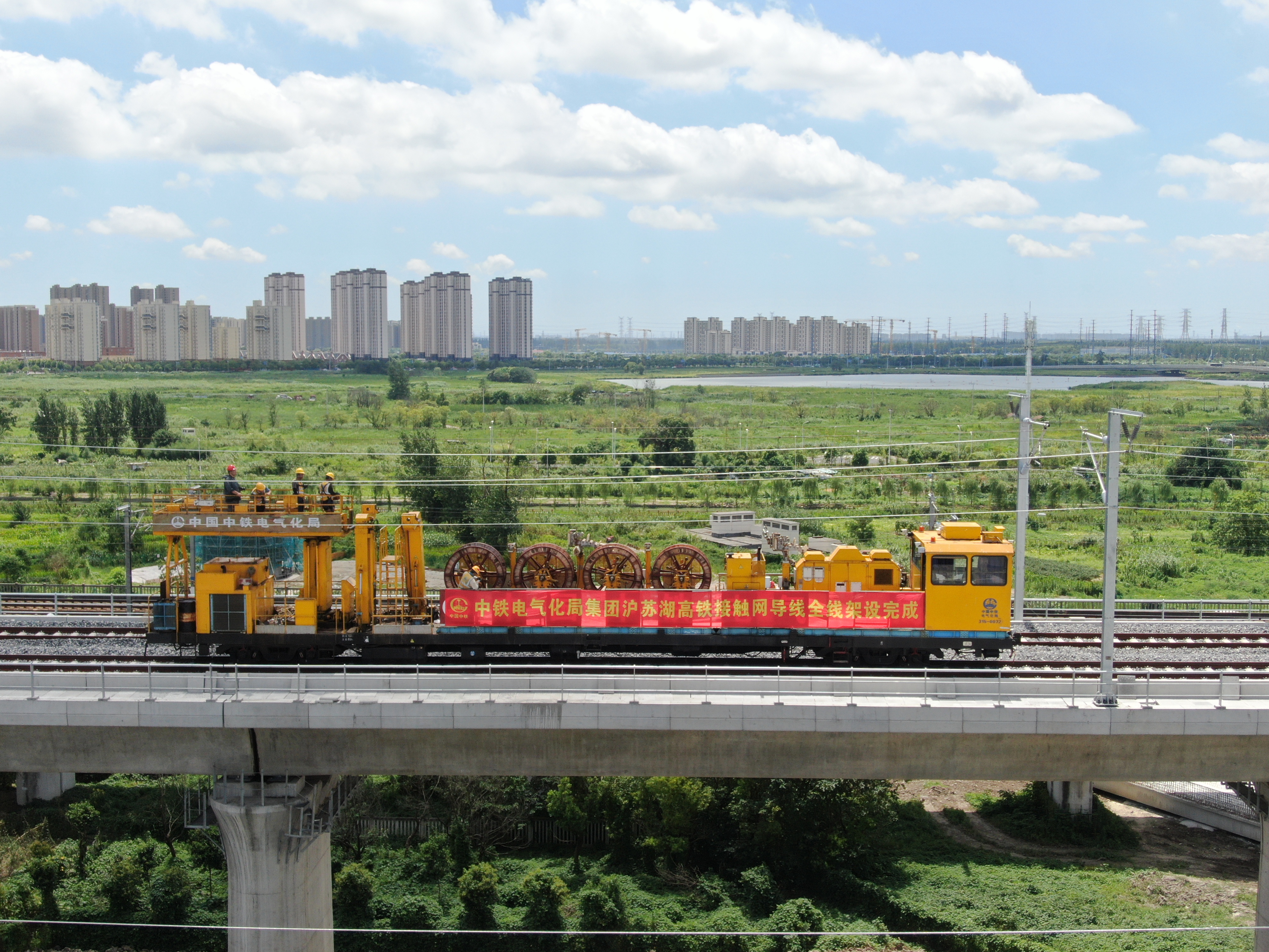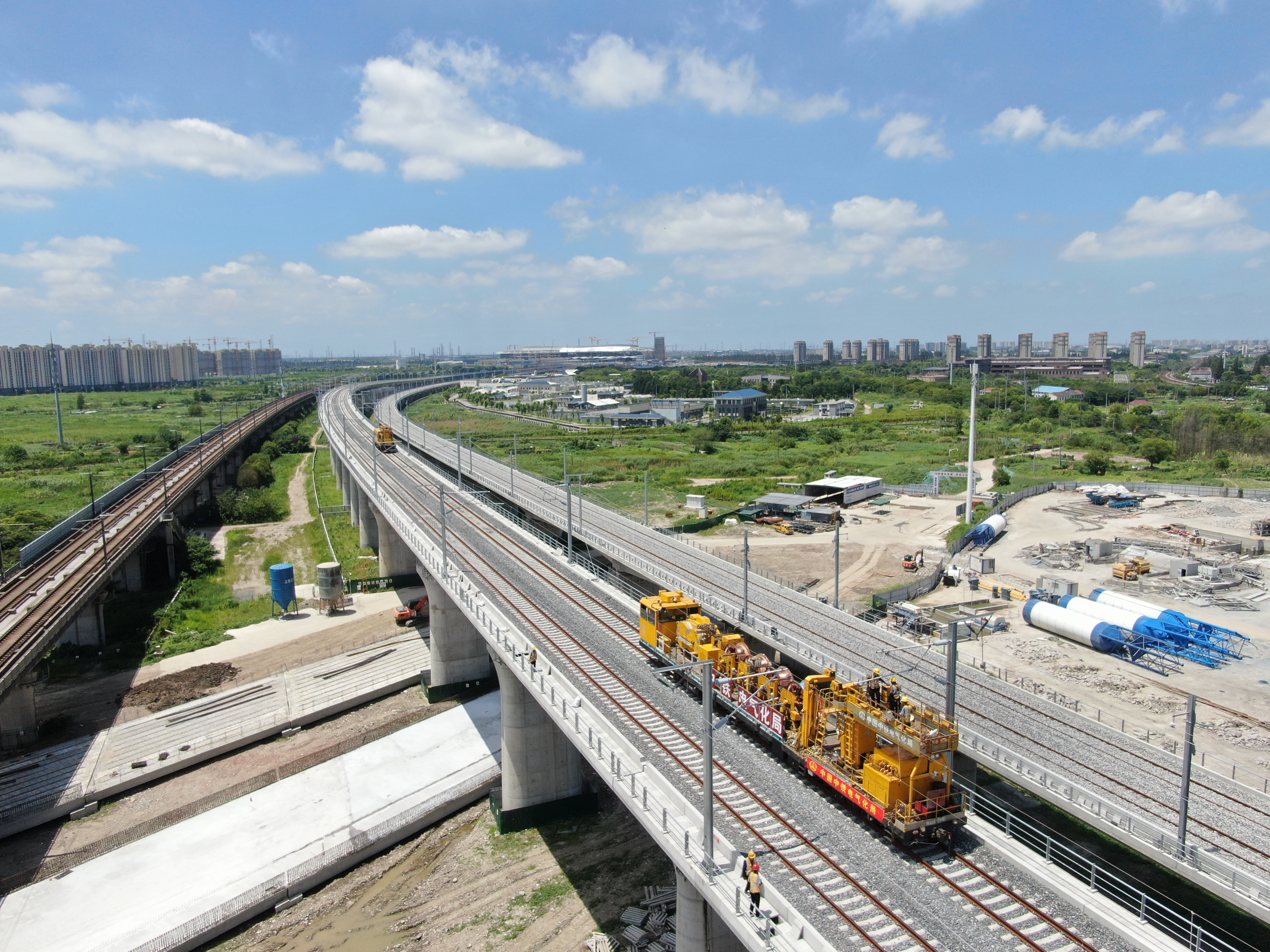 交汇点讯 7月30日,新华日报·交汇点记者从中国铁路上海局集团有限公司获悉,沪苏湖高铁上海虹桥站至上海松江站间最后一段锚段接触网导线架设完成,标志着该项目全线接触网架设完成,为下一步静态验收和联调联试奠定了坚实的基础。