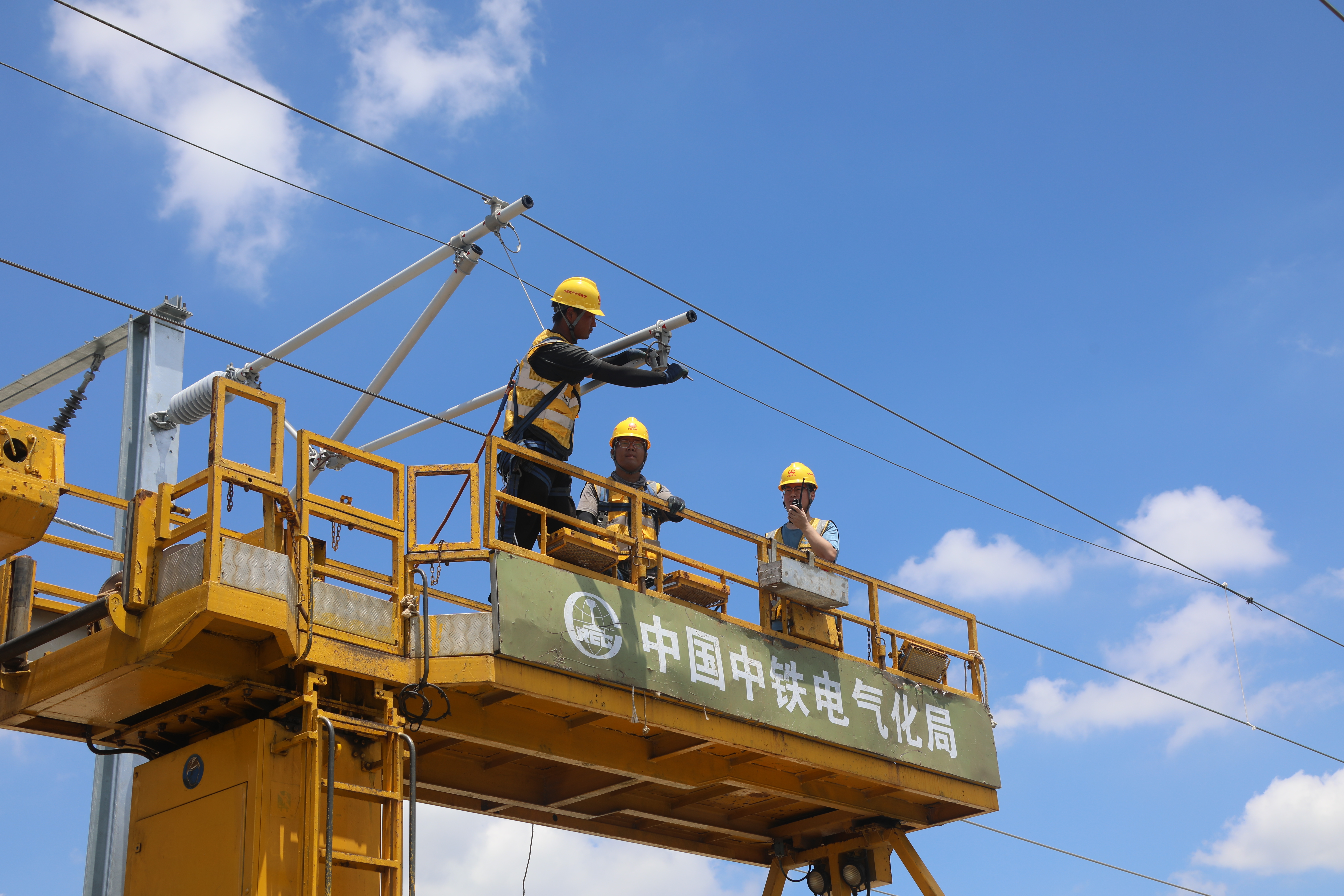 接触网是为高铁列车输送电能的“大动脉”,行驶过程中,列车通过车顶的受电弓与接触网导线相接触获取电能。沪苏湖高铁于2022年12月23日进行接触网第一杆支柱组立,历时525天共计组立7237根支柱;今年4月4日进行首条接触线架设,历时118天共架设接触网导线591条公里。