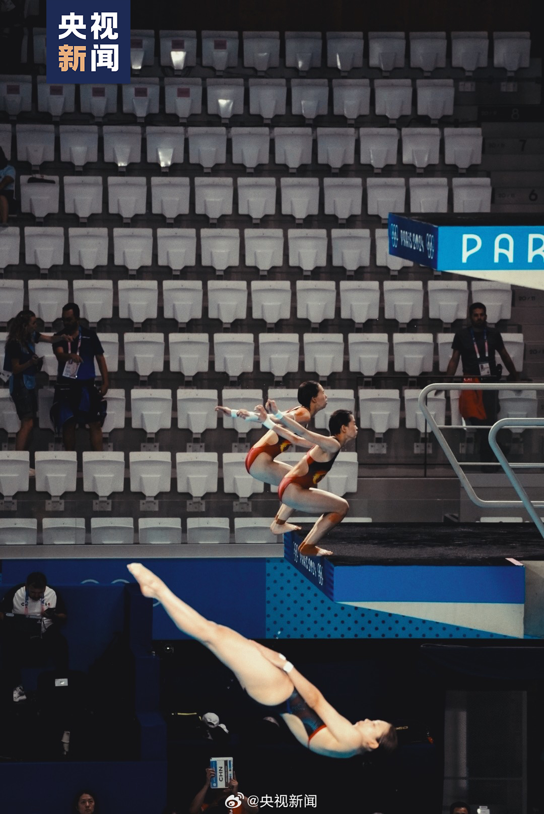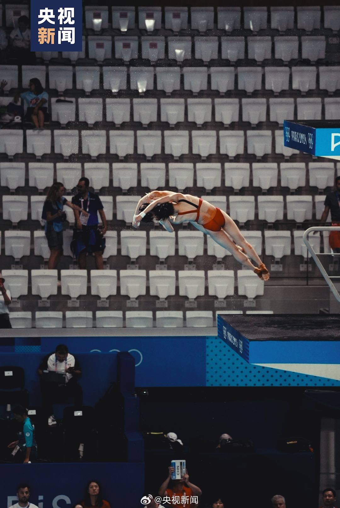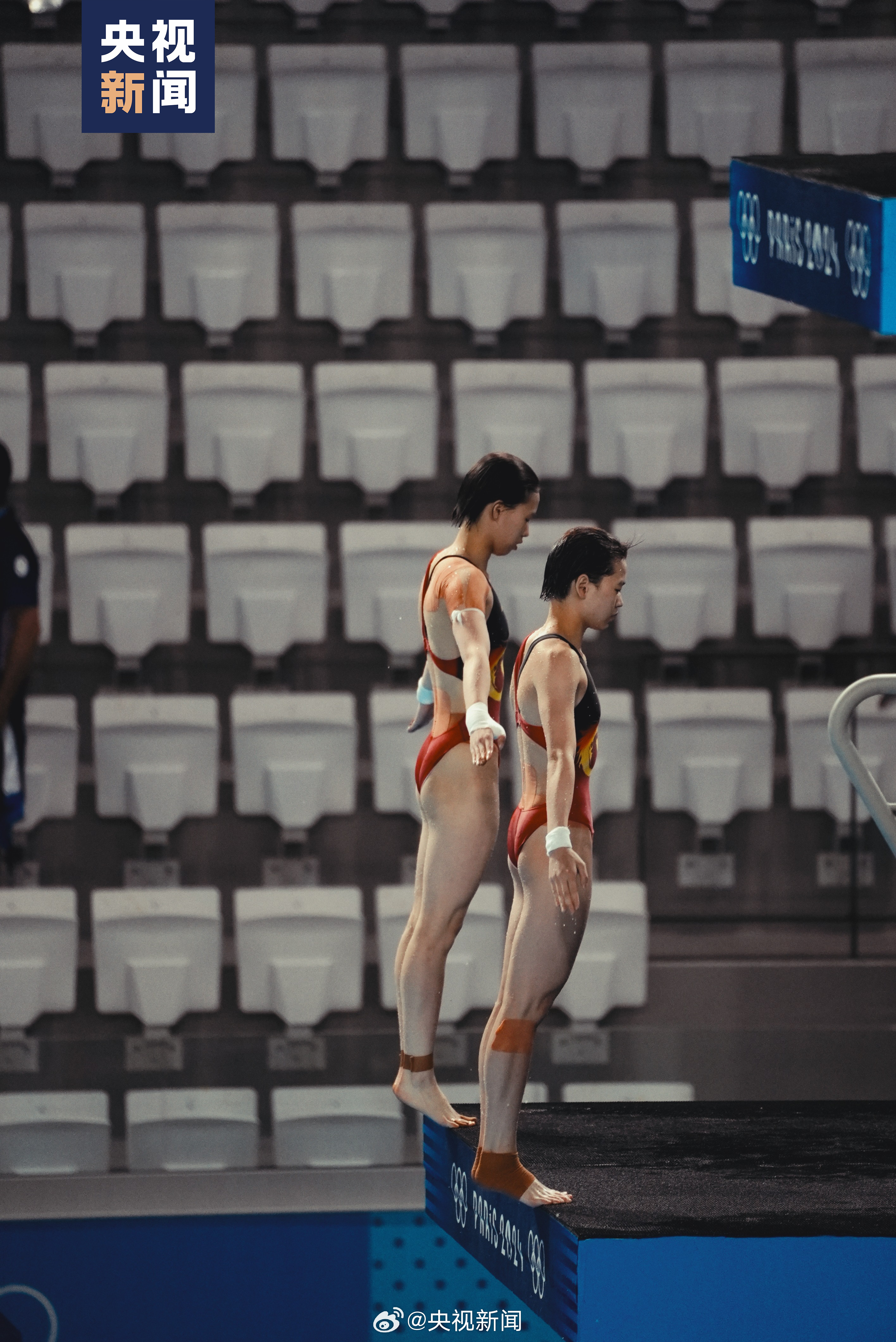 今天下午17点,巴黎奥运会跳水女子双人10米台比赛将举行。赛前热身环节,中国组合全红婵 /陈芋汐的动作整齐划一。